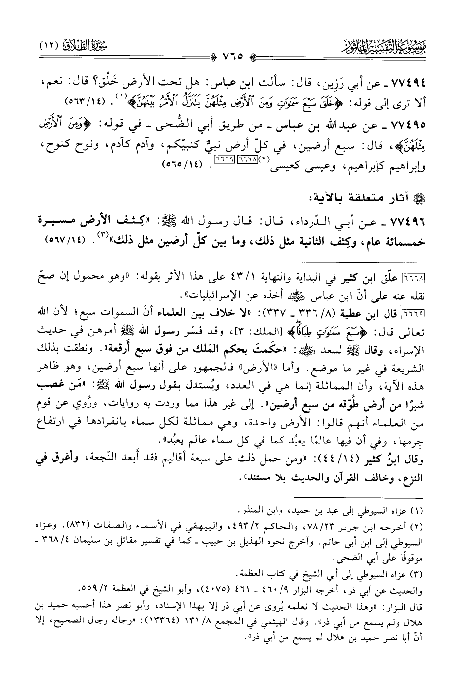 ٧٧٤٩٤ - عن أبي رَزِين، قال: سألت ابن عباس: هل تحت الأرض خَلْق؟ قال: نعم، ألا ترى إلى قوله: {خَلَقَ سَبْعَ سَماواتٍ ومِنَ الأَرْضِ مِثْلَهُنَّ يَتَنَزَّلُ الأَمْرُ بَيْنَهُنَّ} (¬١). (١٤/ ٥٦٣)