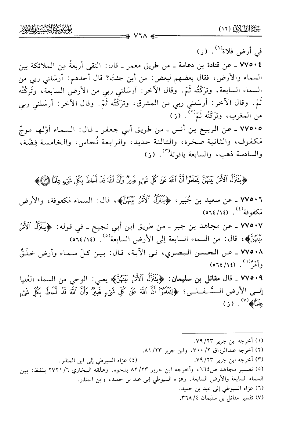 ٧٧٥٠٨ - عن الحسن البصري، في الآية، قال: بين كلّ سماء وأرض خلْقٌ وأمْرٌ (¬٦). (١٤/ ٥٦٤)