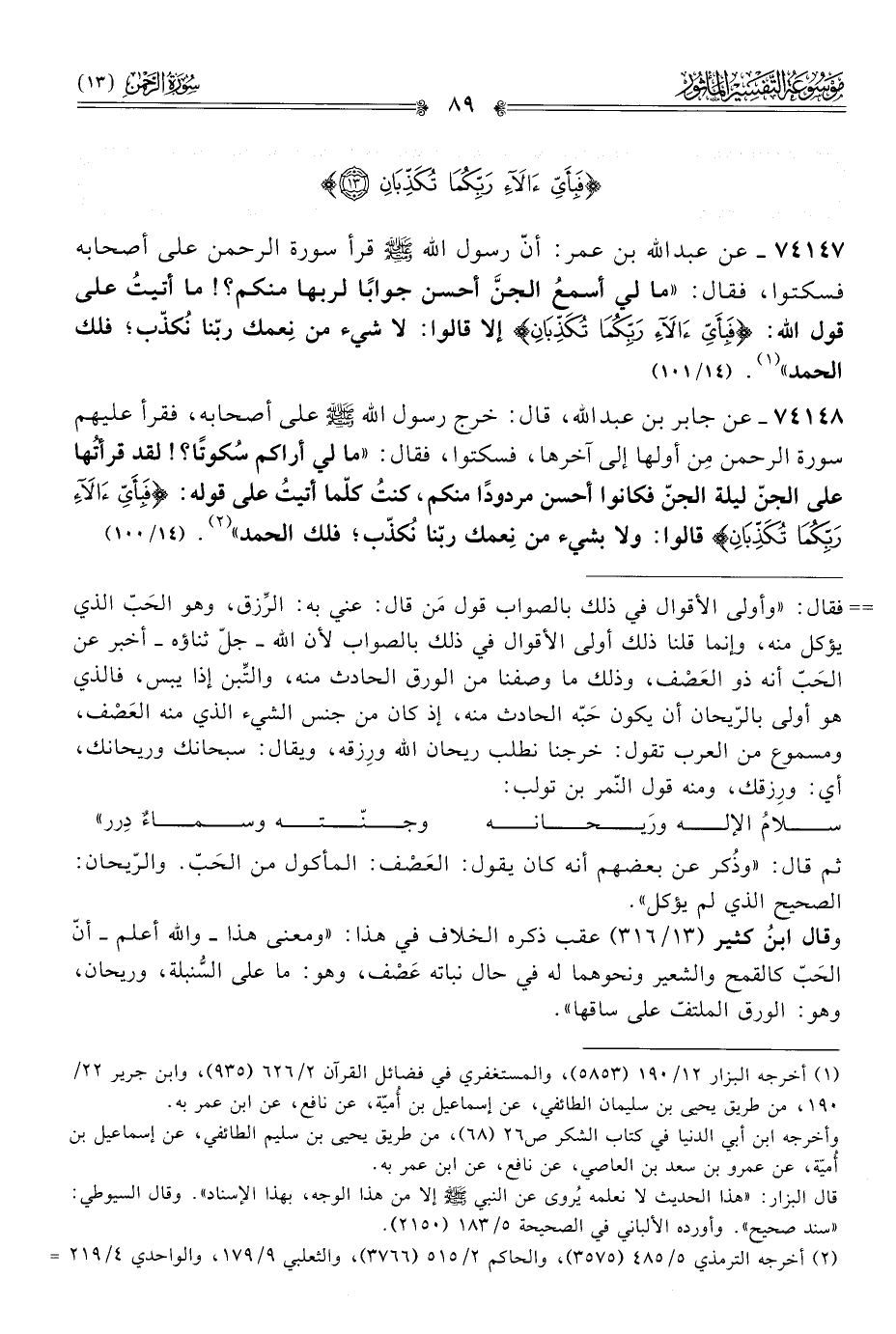 ٧٤١٤٧ - عن عبد الله بن عمر: أنّ رسول الله - صلى الله عليه وسلم - قرأ سورة الرحمن على أصحابه فسكتوا، فقال: «ما لي أسمعُ الجنَّ أحسن جوابًا لربها منكم؟! ما أتيتُ على قول الله: {فَبِأَيِّ آلاءِ رَبِّكُما تُكَذِّبانِ} إلا قالوا: لا شيء من نِعمك ربّنا نُكذّب؛ فلك الحمد» (¬١). (١٤/ ١٠١)