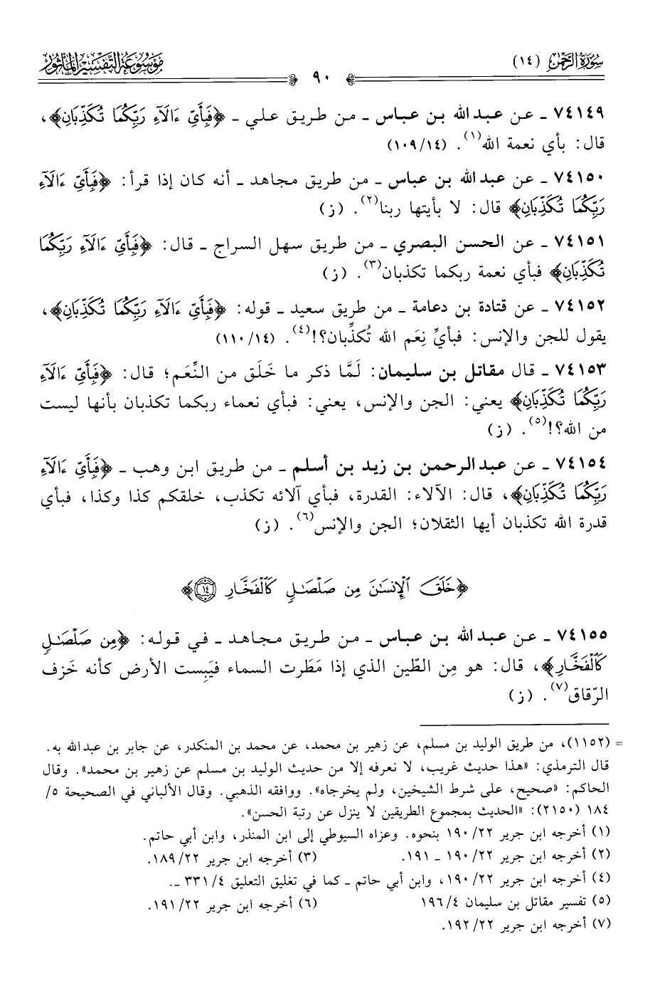 ٧٤١٥٢ - عن قتادة بن دعامة -من طريق سعيد- قوله: {فَبِأَيِّ آلاءِ رَبِّكُما تُكَذِّبانِ}، يقول للجن والإنس: فبأيِّ نِعَم الله تُكذِّبان؟! (¬٤). (١٤/ ١١٠)