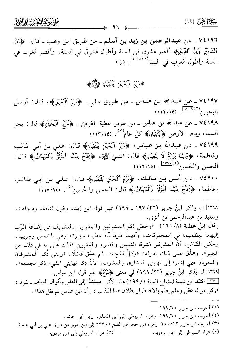 ٧٤٢٠٠ - عن أنس بن مالك، {مَرَجَ البَحْرَيْنِ يَلْتَقِيانِ} قال: علي بن أبي طالب وفاطمة، {يَخْرُجُ مِنهُما اللُّؤْلُؤُ والمَرْجانُ} قال: الحسن والحُسين (¬٥). (١٤/ ١١٧)