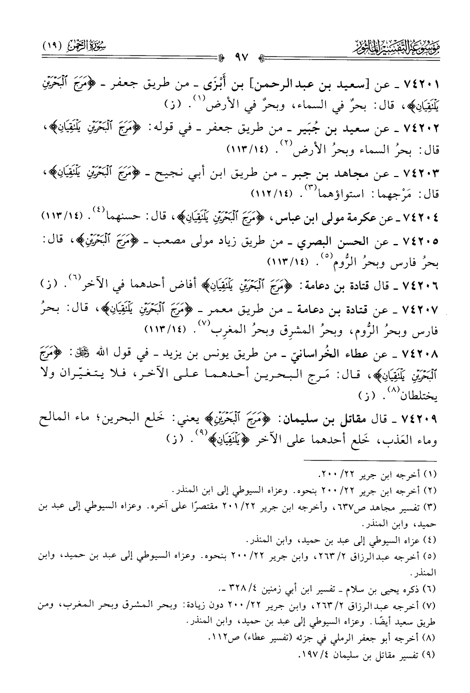 ٧٤٢٠٧ - عن قتادة بن دعامة -من طريق معمر- {مَرَجَ البَحْرَيْنِ يَلْتَقِيانِ}، قال: بحرُ فارس وبحرُ الرُّوم، وبحرُ المشرِق وبحرُ المغرِب (¬٧). (١٤/ ١١٣)