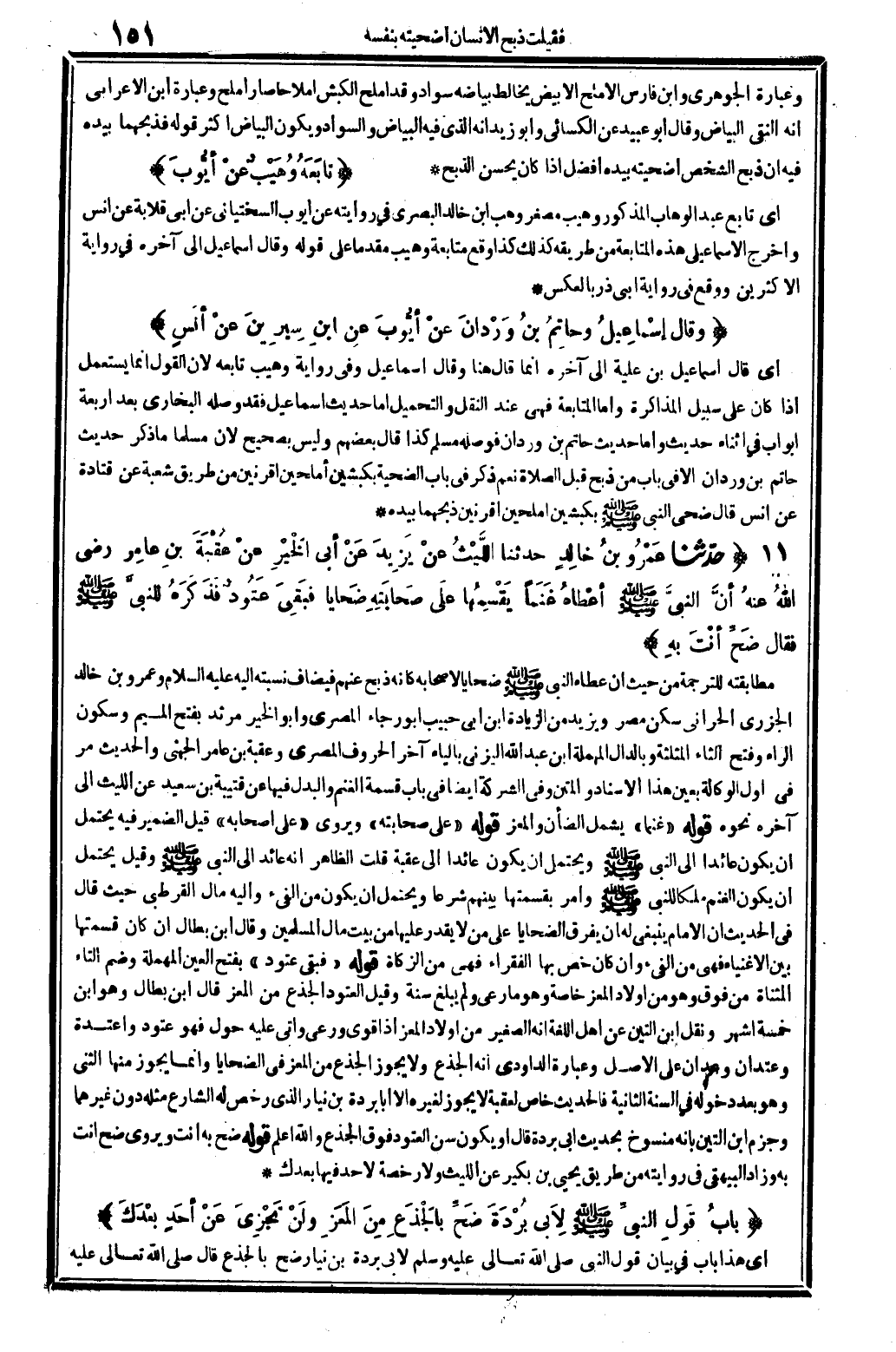 5555 - حدَّثنا عَمْرو بنُ خالدِ حدَّثنا اللَّيثُ عنْ يَزِيدَ عَنْ أَبي الخَيْرِ عنْ عُقْبَةَ بنِ عامِر رَضِي الله عنهُ أَن النَّبيَّ أَعطاهُ غَنَماً يَقْسِمُها عَلى صَحابَتِه ضَحايا فبَقِيَ عَتُودٌ فَذَكَرَهُ للنبيَّ صلى الله عَلَيْهِ وَسلم فَقَالَ ضحِّ أنتَ بهِ.