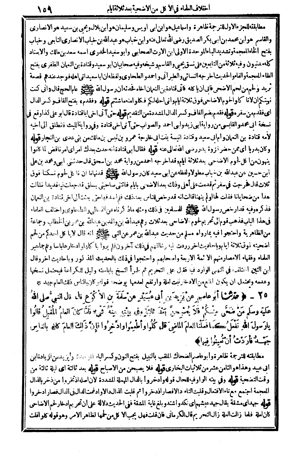 وَاخْتلف الْعلمَاء فِي هَذَا الْبَاب فَذهب قوم إِلَى تَحْرِيم لُحُوم الْأَضَاحِي بعد ثَلَاث، وهم: عبد الله بن وَاقد بن عبد الله بن عمر بن الْخطاب وَجَمَاعَة من الظَّاهِرِيَّة، وَاحْتَجُّوا فِيهِ بِمَا رَوَاهُ مُسلم من حَدِيث عبد الله بن عمر عَن النَّبِي صلى الله عَلَيْهِ وَسلم، أَنه قَالَ: لَا يَأْكُل أحدكُم من لحم أضحيته فَوق ثَلَاثَة أَيَّام، وبأحاديث أخر وَردت فِيهِ، وَخَالفهُم فِي ذَلِك آخَرُونَ فَلم يرَوا بأكلها وادخارها بَأْسا وهم جَمَاهِير الْعلمَاء وفقهاء الْأَمْصَار مِنْهُم الْأَئِمَّة الْأَرْبَعَة وأصحابهم، وَاحْتَجُّوا فِي ذَلِك بِالْحَدِيثِ الْمَذْكُور، وبأحاديث أخر، وَقَالَ ابْن التِّين: اخْتلف فِي النَّهْي الْوَارِد فِيهِ، فَقيل: على التَّحْرِيم ثمَّ طَرَأَ النّسخ بإباحته، وَقيل: للكراهة، فَيحْتَمل نسخهَا وَعَدَمه، وَيحْتَمل أَن يكون الْمَنْع من الإدخار ثَبت لعِلَّة وارتفع لعدمها، يُوضحهُ قَوْله: وَكَانَ بِالنَّاسِ ذَلِك الْعَام جهد.