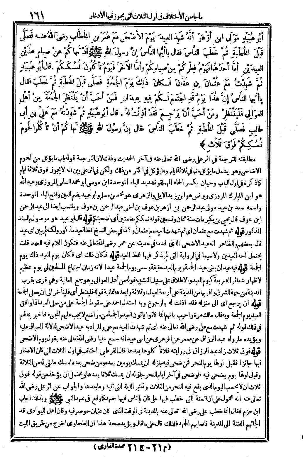 5572 - حدَّثنا قَالَ أبُو عُبَيْدٍ: ثُمَّ شَهِدْتُ مَعَ عُثْمَانَ بنِ عَفَّانَ فَكَانَ ذالِكَ يَوْمَ الجُمُعَةِ فَصَلَّى قَبْلَ الخُطْبَةِ ثُمَّ خَطَبَ فَقَالَ: يَا أيُّها النَّاسُ} إنَّ هاذا يَوْمٌ قَدِ اجْتَمَعَ لَكُمْ فِيهِ عِيدَانِ، فَمَنْ أحَبَّ أنْ يَنْتَظِرَ الجُمُعَةَ مِنْ أهْلِ العَوَالِي فَلْيَنْظِرْ وَمَنْ أحَبَّ أنْ يَرْجِعَ فَقَدْ أذِنْتُ لَهُ. قَالَ أبُو عُبَيْدٍ: ثُمَّ شَهِدْتُهُ مَعَ عَلِيِّ بنِ أبِي طَالِبٍ فَصَلَّى قَبْلَ الخُطْبَةِ ثُمَّ خَطَبَ النًّاسَ فَقَالَ: إنَّ رَسُولَ الله صلى الله عَلَيْهِ وَسلم، نَهَاكُمْ أنْ تَأْكُلُوا لُحُومَ نُسُكَكُمْ فَوْقَ ثلاثٍ.
