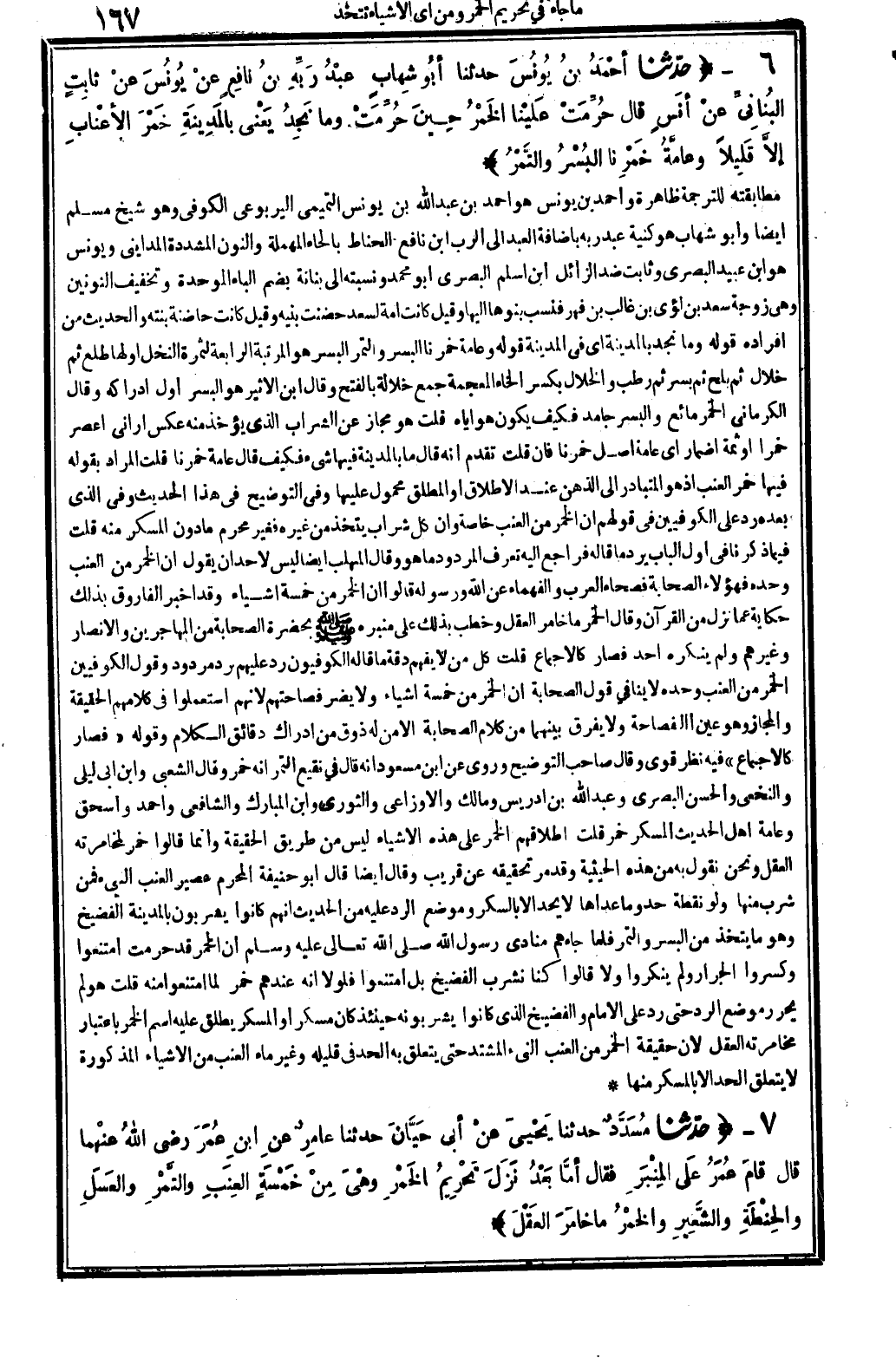 5581 - حدّثنا مُسَدَّدٌ حَدثنَا يَحْيىَ عنْ أبي حَيَّانَ حَدثنَا عامِرٌ عَن ابنِ عُمَرَ، رَضِي الله عَنْهُمَا قَالَ: قامَ عُمَرُ عَلى المِنْبَرِ، فَقَالَ: أمَّا بَعْدُ نَزَلَ تَحْرِيمُ الخَمْرِ وهْيَ مِنْ خَمْسَةٍ: العِنَبِ والتَّمْرِ والعَسَلِ والحِنْطَةِ والشَّعِيرِ، والخمْرُ مَا خامَرَ العَقْلَ.