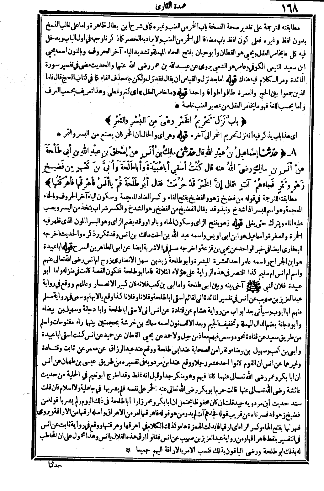 5582 - حدّثنا إسْماعِيلُ بنُ عبْدِ الله، قَالَ: حدّثني مالِكُ بنُ أنَسٍ عنْ إسْحاقَ بنِ عبْدِ الله بنِ أبي طَلْحَةَ عنْ أنَسِ بنِ مالِكٍ، رضيَ الله عَنهُ، قَالَ: كُنْتُ أسقِي أَبَا عُبَيْدَةَ وَأَبا طَلْحَةَ وأُُبَيَّ بنَ كَعْبٍ مِن فَضيخِ زَهْوٍ وتَمْرٍ، فَجاءَهُمْ آتٍ، فَقَالَ: إنَّ الخَمْرَ قَدْ حُرِّمَتْ. فَقَالَ أبُو طَلْحَةَ: قُمْ يَا أنَسُ فأهْرِقْها، فأهْرَقْتُها.