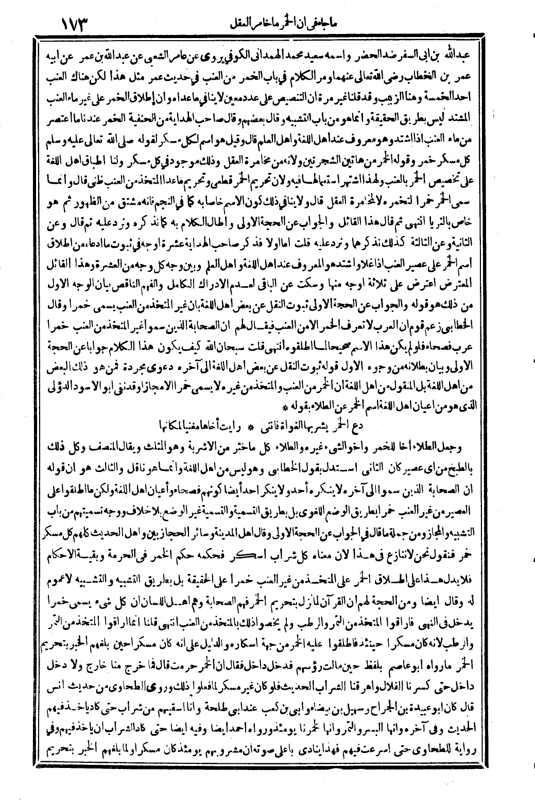 عبد الله بن أبي السّفر ضد الْحَضَر واسْمه سعيد مُحَمَّد الْهَمدَانِي الْكُوفِي يروي عَن عَامر الشّعبِيّ عَن عبد الله بن عمر عَن أَبِيه عمر بن الْخطاب رَضِي الله عَنْهُمَا وَمر الْكَلَام فِي: بَاب الْخمر من الْعِنَب، فِي حَدِيث عمر مثل هَذَا، لَكِن هُنَاكَ الْعِنَب أحد الْخَمْسَة، وَهنا الزَّبِيب، وَقد قُلْنَا غير مرّة: إِن التَّنْصِيص على عدد معِين لَا يُنَافِي مَا عداهُ، وَإِن إِطْلَاق الْخمر على غير مَاء الْعِنَب المشتد لَيْسَ بطرِيق الْحَقِيقَة، وَإِنَّمَا هُوَ من: بَاب التَّشْبِيه، وَقَالَ بَعضهم: وَقَالَ صَاحب (الْهِدَايَة) من الْحَنَفِيَّة: الْخمر عندنَا مَا اعتصر من مَاء الْعِنَب إِذا اشْتَدَّ وَهُوَ مَعْرُوف عِنْد أهل اللُّغَة وَأهل الْعلم. قَالَ: وَقيل: هُوَ اسْم لكل مُسكر لقَوْله صلى الله عَلَيْهِ وَسلم: كل مُسكر خمر، وَقَوله: (الْخمر من هَاتين الشجرتين) وَلِأَنَّهُ من مخامرة الْعقل وَذَلِكَ مَوْجُود فِي كل مُسكر، وَلنَا: إطباق أهل اللُّغَة على تَخْصِيص الْخمر بالعنب، وَلِهَذَا اشْتهر اسْتِعْمَالهَا فِيهِ، وَلِأَن تَحْرِيم الْخمر قَطْعِيّ وَتَحْرِيم مَا عدا الْمُتَّخذ من الْعِنَب ظَنِّي، قَالَ: وَإِنَّمَا سمي الْخمر خمرًا لتخمره لَا لمخامرة الْعقل. قَالَ: وَلَا يُنَافِي ذَلِك كَون الِاسْم خَاصّا بِهِ، كَمَا فِي النَّجْم فَإِنَّهُ مُشْتَقّ من الظُّهُور ثمَّ هُوَ خَاص بِالثُّرَيَّا. انْتهى. ثمَّ قَالَ: هَذَا الْقَائِل: وَالْجَوَاب عَن الْحجَّة الأولى وَأطَال الْكَلَام بِهِ كَمَا نذكرهُ ونرد عَلَيْهِ، ثمَّ قَالَ: وَعَن الثَّانِيَة وَعَن الثَّالِثَة كَذَلِك نذكرهما ونرد عَلَيْهِ. قلت: أما أَولا فَذكر صَاحب (الْهِدَايَة) عشرَة أوجه فِي ثُبُوت مَا ادَّعَاهُ من إِطْلَاق اسْم الْخمر على عصير الْعِنَب إِذا غلا وَاشْتَدَّ هُوَ الْمَعْرُوف عِنْد أهل اللُّغَة. وَأهل الْعلم وَبَين وَجه كل وَجه من الْعشْرَة، وَهَذَا الْقَائِل الْمُعْتَرض اعْترض على ثَلَاثَة أوجه مِنْهَا وَسكت عَن الْبَاقِي لعدم الْإِدْرَاك الْكَامِل والفهم النَّاقِص. بَيَان الْوَجْه الأول: من ذَلِك هُوَ قَوْله: وَالْجَوَاب عَن الْحجَّة الأولى ثُبُوت النَّقْل عَن بعض أهل اللُّغَة بِأَن غير الْمُتَّخذ من الْعِنَب يُسمى خمرًا، وَقَالَ الْخطابِيّ: زعم قوم أَن الْعَرَب لَا تعرف الْخمر إلاَّ من الْعِنَب، فَيُقَال لَهُم: إِن الصَّحَابَة الَّذين سموا غير الْمُتَّخذ من الْعِنَب خمرًا عرب فصحاء، فَلَو لم يكن هَذَا الِاسْم صَحِيحا لما أَطْلقُوهُ. انْتهى قلت: سُبْحَانَ الله! كَيفَ يكون هَذَا الْكَلَام جَوَابا عَن الْحجَّة الأولى وَبَيَان بُطْلَانه من وُجُوه.