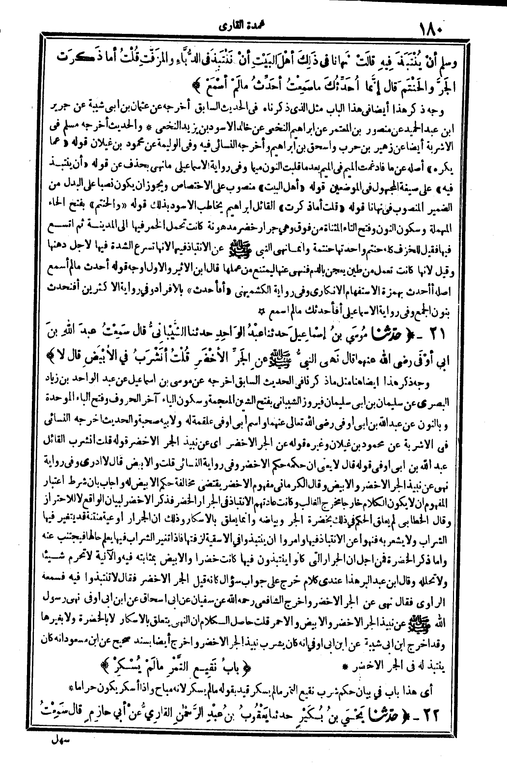 5596 - حدّثنامُوسَى بنُ إسْماعِيلَ حَدثنَا عبْدُ الوَاحِدِ حَدثنَا الشَّيْبانِيُّ قَالَ: سَمِعْتُ عبدَ الله بنَ أبي أوْفَى رَضِي الله عَنْهُمَا قَالَ: نَهى النبيُّ صلى الله عَلَيْهِ وَسلم عَن الجَرِّ الأخْضَرِ، قُلْتُ: أنَشْرَبُ فِي الأبْيَضِ؟ قَالَ: لَا.