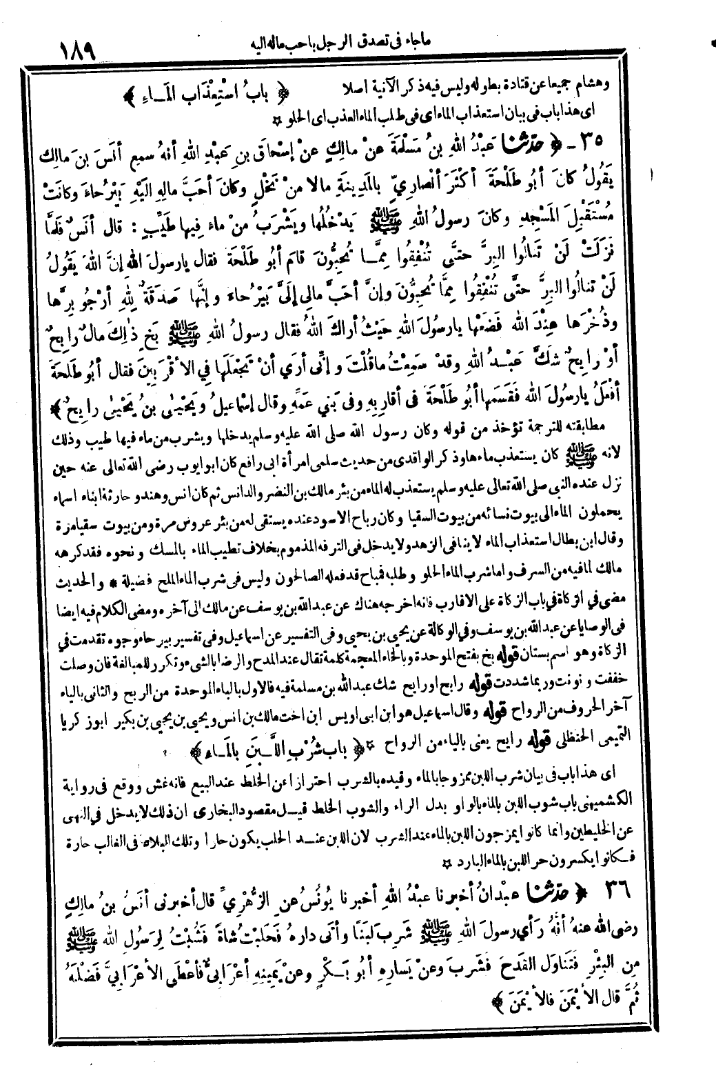5611 - حدّثناعَبْدُ الله بنُ مَسْلَمَةَ عنْ مالِكٍ عنْ إسْحاقَ بنِ عَبْدِ الله أنهُ سمِع أنَسَ بنَ مالِك يَقُولُ: كانَ أبُو طَلْحَةَ أكْثَرَ أنْصارِيّ بالمَدِينَةِ مَالا منْ نَخْلٍ، وكانَ أحَبَّ مالِهِ إلَيْهِ بَيْرُحاءٍ، وكانَتْ مُسْتَقْبِلَ المَسْجِدِ، وكانَ رسولُ الله صلى الله عَلَيْهِ وَسلم يَدْخُلُها ويَشْرَبُ منْ ماءٍ فِيها طَيِّبٍ، قَالَ أنَسٌ: فَلمَّا نَزَلَتْ: {لن تنالوا الْبر حَتَّى تنفقوا مِمَّا تحبون} (آل عمرَان: 92) . قامَ أبُو طَلْحَة فَقَالَ: يَا رسولَ الله! إنَّ الله يَقُولُ: {لَنْ تنالُو البِرَّ حتاى تُنْفِقُوا مِمَّا تُحِبُّونَ} وإنَّ أحَبَّ مَالِي إلَيَّ بَيْرُحاءَ، وإنَّها صَدَقَةٌ لله أرْجُو بِرَّها وذُخْرَها عِنْدَ الله، فَضَعْها يَا رسُولَ الله حَيْثُ أراكَ الله. فَقَالَ رسولُ الله صلى الله عَلَيْهِ وَسلم: بَخِ ذالِكَ مالٌ رابِحٌ أوْ: رايِحٌ شَكَّ عَبْدُ الله، وقدْ سَمِعْتُ مَا قُلْتَ وإنِّي أرَى أنْ تَجْعَلَها فِي الأقْرَبِينَ. فَقَالَ أبُو طَلحَةَ: أفْعَلُ يَا رسُولَ الله، فَقَسَمَها أبُو طَلْحَةَ فِي أقارِبِهِ وَفِي بَني عَمِّه، وَقَالَ إسْماعيلُ ويَحْياى بنُ يَحْياى: رايِحٌ.