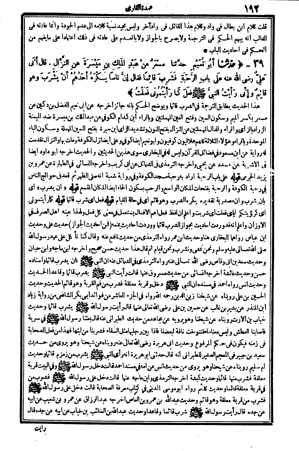 5615 - حدّثناأبُو نُعَيْمٍ حدَّثنا مسْعَرٌ عنْ عَبْدِ المَلِكِ بنِ مَيْسَرَةَ عنِ النّزَّالِ. قَالَ: أتَى عَلِيُّ رَضِي الله عَنهُ علَى بابِ الرَّحَبَةِ فَشَرِبَ قائِماً، فَقَالَ: إنَّ نَاسا يَكْرَهُ أحَدُهُمْ أنْ يَشْرَبَ وَهُوَ قائِمٌ، وإِنِّي رَأيْتُ النبيَّ صلى الله عَلَيْهِ وَسلم فَعَلَ كَما رَأيْتُمُوني فَعَلْتُ. (انْظُر الحَدِيث: 5615 طرفه فِي: 5616) .