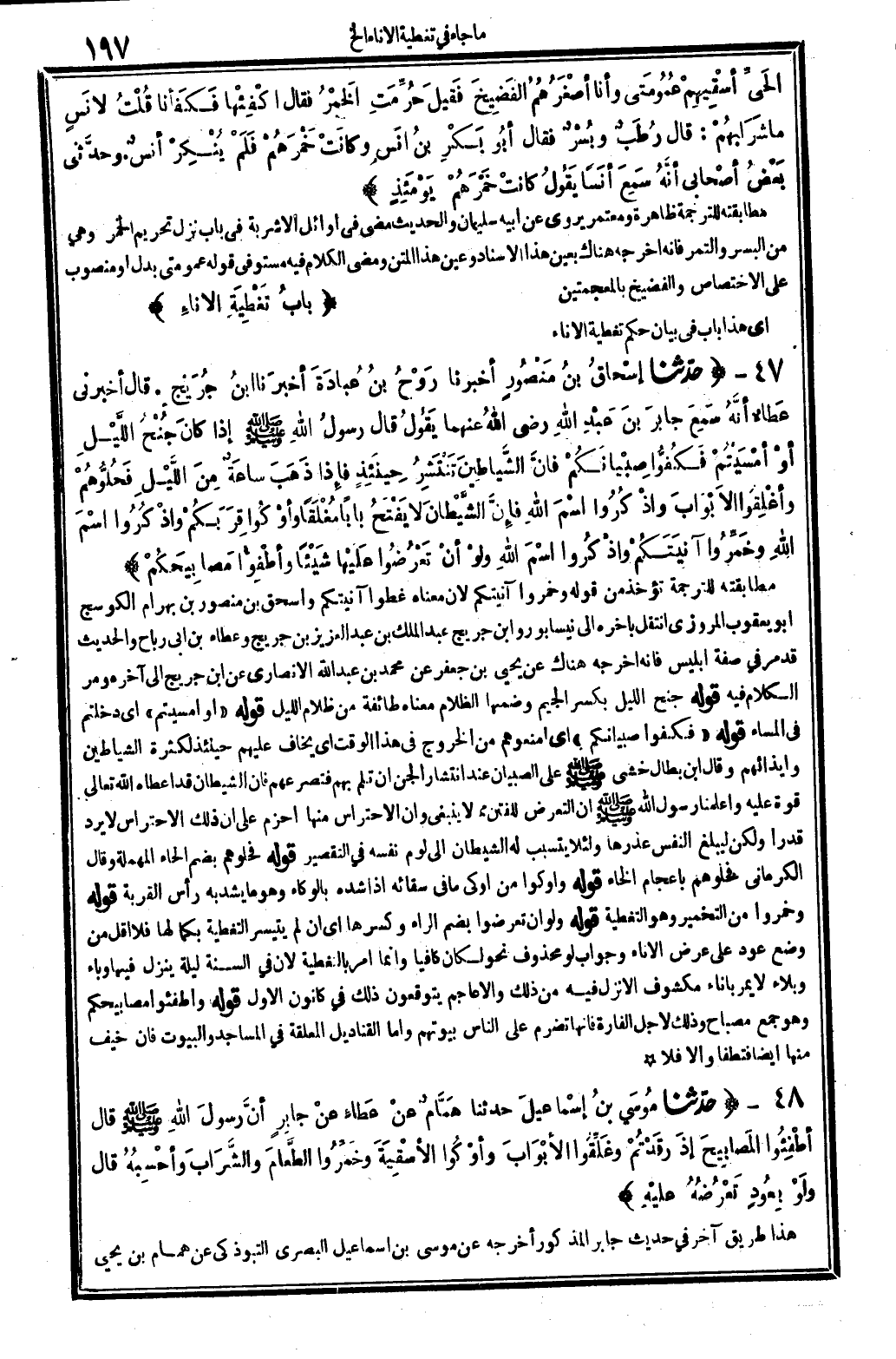 5624 - حدّثنامُوسَى بنُ إسْماعيلَ حَدثنَا هَمَّامٌ عنْ عَطاءٍ عنْ جابِرٍ أنَّ رسولَ الله صلى الله عَلَيْهِ وَسلم قَالَ: أطْفِئُوا المَصابِيحَ إذَا رقَدْتُمْ، وغَلِّقُوا الأبْوَابَ وأوْكُوا الأسْقِيَةَ وخَمِّرُوا الطَّعامَ والشَّرَابَ، وأحْسِبُهُ قَالَ: ولَوْ بِعُودٍ تَعْرُضُهُ عليْهِ.