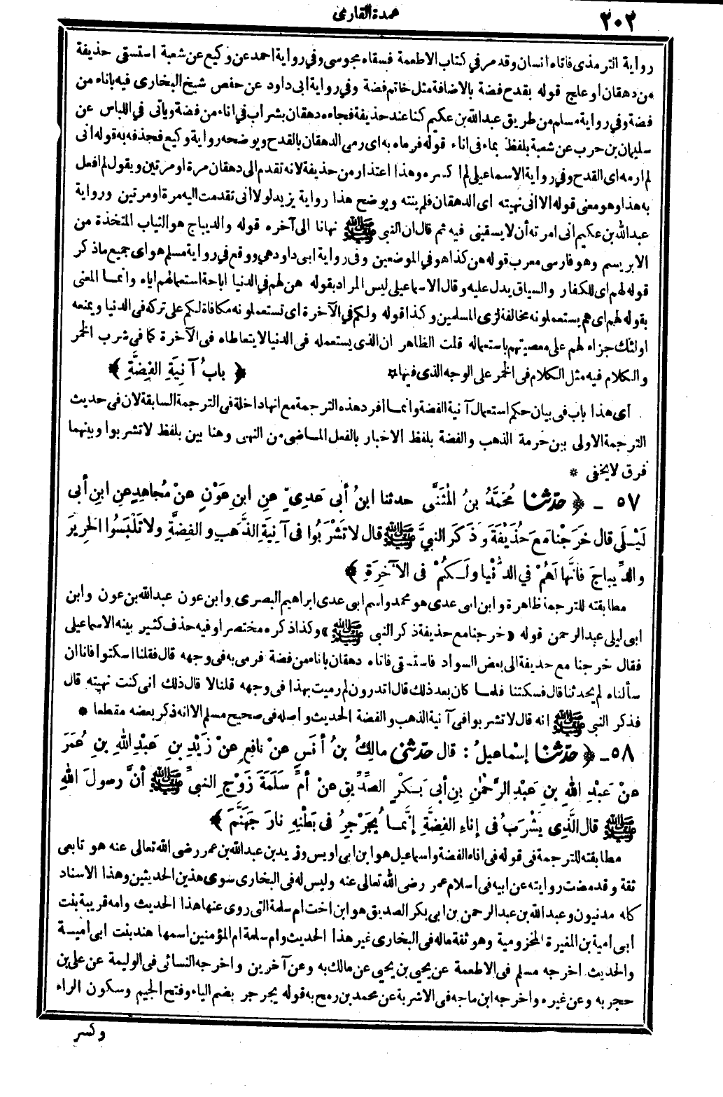 5634 - حدّثنا إسْماعِيلُ قَالَ: حدّثني مالِكُ بنُ أنَسٍ عنْ نافِعٍ عنْ زَيْدِ بنِ عَبْدِ الله بنِ عُمَرَ عنْ عَبْدِ الله بنِ عَبْدِ الرَّحْمانِ بنِ أبي بَكْرٍ الصِّدِّيق عنْ أمِّ سَلَمَةَ زَوْجِ النبيِّ صلى الله عَلَيْهِ وَسلم أنَّ رسولَ الله قَالَ: الَّذِي يَشْرَبُ فِي إناءٍ الفِضَّةِ إنَّما يُجَرْجِرُ فِي بَطْنِهِ نارَ جَهَنَّم.