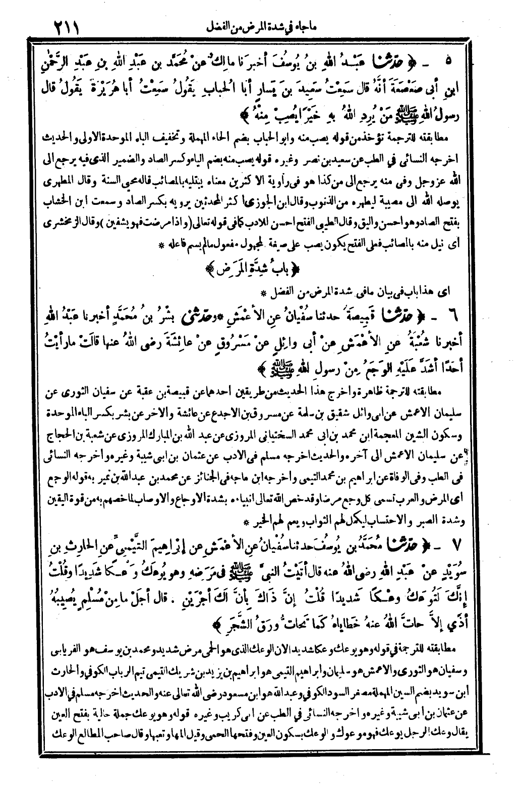 5646 - حدّثنا قَبِيصَةُ حَدثنَا سُفْيانُ عنِ الأعْمَشِ، وحدّثني بشْرُ بنُ مُحَمَّدٍ أخبرنَا عَبْدُ الله أخبرنَا شُعْبَةُ عنِ الأعْمَشِ عنْ أبي وائِلٍ عنْ مَسْرُوقٍ عنْ عائِشَةَ، رَضِي الله عَنْهَا، قالَتْ: مَا رأيْتُ أحَداً أشَدَّ عَلَيْهِ الوَجَعُ مِنْ رسولِ الله صلى الله عَلَيْهِ وَسلم.