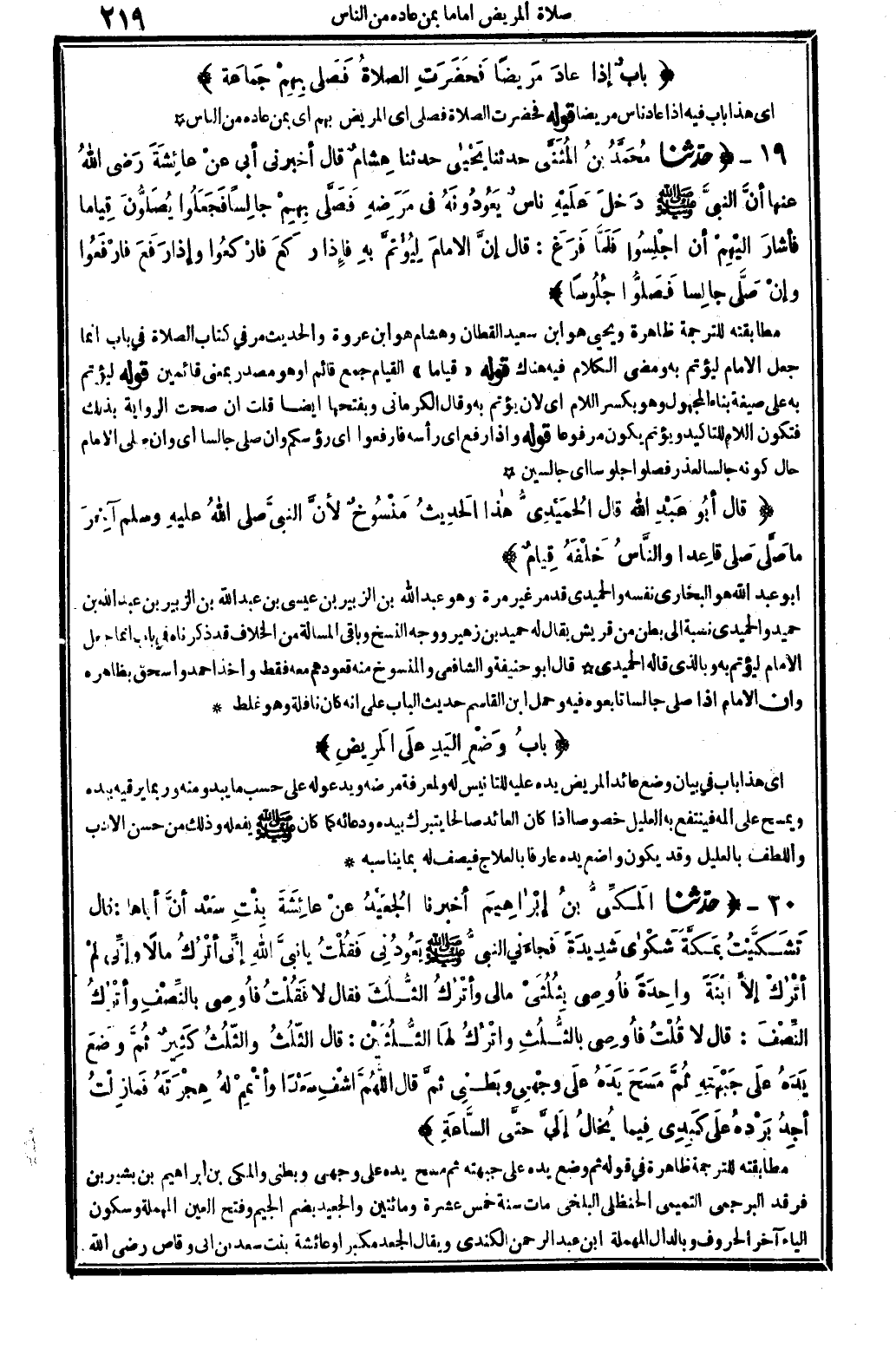 {قَالَ أبُو عَبْدِ الله: قَالَ الحُمَيْدِيُّ: هَذَا الحَدِيثُ مَنْسُوخٌ لأنَّ النبيَّ صلى الله عَلَيْهِ وَسلم، آخِرَ مَا صَلَّى صَلى قاعِداً والنَّاسُ خلفَهُ قِيامٌ} .