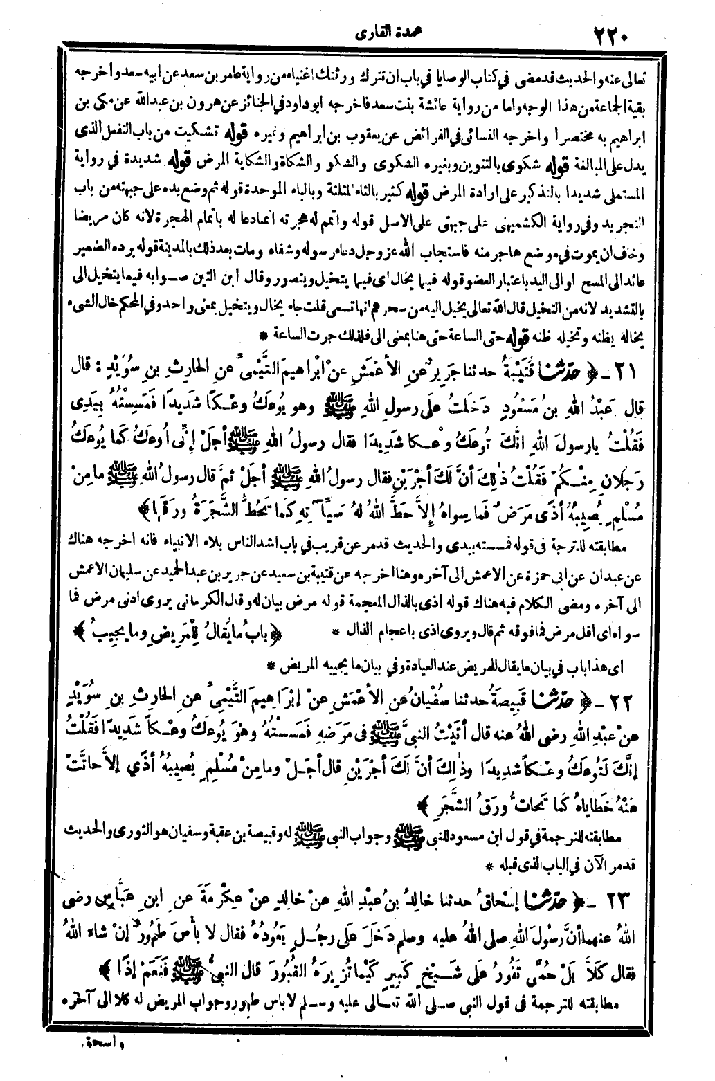 5660 - حدّثنا قُتَيْبةُ حَدثنَا جَرِيرٌ عنِ الأعْمَشِ عنْ إبْراهيمَ التَّيْميِّ عنِ الحارِثِ بنِ سُوَيْدٍ، قَالَ: قَالَ عَبْدُ الله بنُ مَسْعُودٍ: دَخَلتُ علَى رسولِ الله صلى الله عَلَيْهِ وَسلم وَهُوَ يُوعَكُ وعْكاً شَديداً، فَمَسِسْتُهُ بِيَدِي فَقُلْتُ: يَا رسولَ الله {أنَّكَ تُوعَكُ وعْكاً شَدِيداً. فَقَالَ رسولُ الله صلى الله عَلَيْهِ وَسلم أجَلْ إِنِّي أُوعَكُ كَما يُوعَكُ رَجُلانِ مِنْكُمْ. فَقُلْتُ: ذالِكَ أنَّ لَكَ أجْرَيْنِ. فَقَالَ رسولُ الله صلى الله عَلَيْهِ وَسلم: أجَلْ. ثمَّ قَالَ رسولُ الله صلى الله عَلَيْهِ وَسلم: مَا مِنْ مُسْلِمٍ يُصِيبُهُ أَذَى مَرَضٌ فَما سِواهُ إِلاَّ حَطَّ الله لهُ سَيئاتِهِ كمَا يَحُطُّ الشَّجَرَةُ ورَقَها.