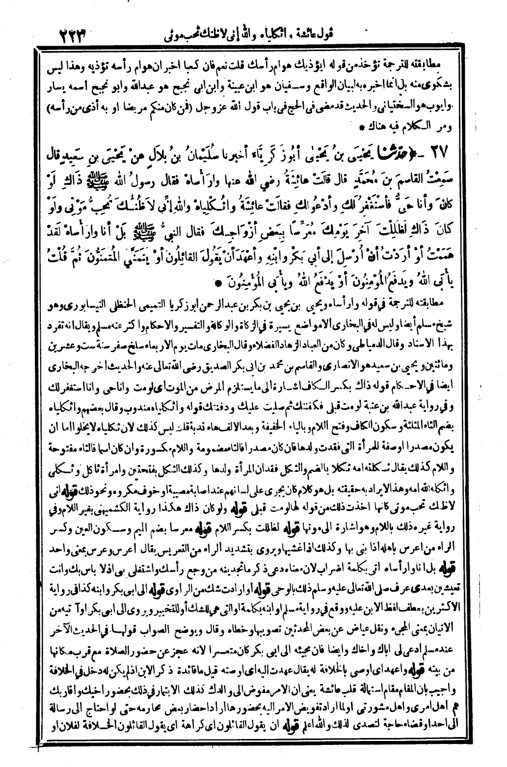 5666 - حدّثنا يَحْيَى بنُ يَحْياى أبُو زَكَرِيَّاءَ أخبرنَا سُلَيْمانُ بنُ بلالٍ عنْ يَحْيَى بنُ سَعِيدٍ قَالَ: سَمِعْتُ القاسمِ بنَ مُحَمَّدٍ قَالَ: قالَتْ عائِشَةُ رَضِي الله عَنْهَا: وارَأْساهْ. فَقَالَ رسولُ الله: ذَاكِ لَوْ كانَ وَأَنا حَيٌّ فأسْتَغْفِرُ لَكِ وأدْعُو لكِ، فقالَتْ عائِشَةُ: واثُكْلِياهْ! وَالله إِنِّي لأَظُنُّكَ تُحِبُّ مَوْتِي، ولَوْ كانَ ذَاكِ لَظَلِلْتَ آخِرَ يَوْمِكَ مُعَرِّساً بِبَعضِ أزْوَاجِكَ، فَقَالَ النبيُّ صلى الله عَلَيْهِ وَسلم: بَلْ أَنا وارأْساهْ لَقدْ هَمَمْتُ أوْ أرَدْتُ أنْ أُرْسِلَ إِلَى أبي بَكْر وابْنِهِ وأعْهَدَ أنْ يَقُولَ القائِلُون أوْ يَتَمَنَّى المُتمَنُّونَ، ثُمَّ قُلْتُ: يأْبَى الله ويَدفَعُ المُؤْمِنُونَ، أوْ: يَدْفَعُ الله ويأْبَى المُؤْمِنُونَ.