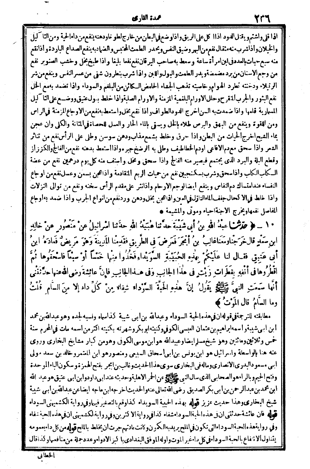 مطابقته للتَّرْجَمَة فِي قَوْله: (إِن فِي هَذِه الْحبَّة السَّوْدَاء) وَعبد الله بن أبي شيبَة كَذَا سَمَّاهُ وَنسبه لجده وَهُوَ عبد الله بن مُحَمَّد بن أبي شيبَة، واسْمه إِبْرَاهِيم بن عُثْمَان الْعَبْسِي الْكُوفِي، وكنيته أَبُو بكر وشهرته بكنيته أَكثر من اسْمه، مَاتَ فِي الْمحرم سنة خمس وَثَلَاثِينَ وَمِائَتَيْنِ، وَهُوَ شيخ مُسلم أَيْضا، وَعبيد الله هُوَ ابْن مُوسَى الْكُوفِي، وَهُوَ من كبار مَشَايِخ البُخَارِيّ، وروى عَنهُ هُنَا بالواسطة، وَإِسْرَائِيل هُوَ ابْن يُونُس بن أبي إِسْحَاق السبيعِي، وَمَنْصُور هُوَ ابْن الْمُعْتَمِر، وخَالِد بن سعد مولى أبي مَسْعُود البدري الْأنْصَارِيّ، وَمَا لَهُ فِي البُخَارِيّ سوى هَذَا الحَدِيث، وغالب بن أبجر بِفَتْح الْهمزَة وَسُكُون الْبَاء الْمُوَحدَة وَفتح الْجِيم وبالراء، هُوَ الصَّحَابِيّ الَّذِي سَأَلَ النَّبِي صلى الله عَلَيْهِ وَسلم عَن الْحمر الْأَهْلِيَّة، وَحَدِيثه عِنْد أبي دَاوُد، وَابْن أبي عَتيق هُوَ عبد الله بن مُحَمَّد بن عبد الرَّحْمَن بن أبي بكر الصّديق رَضِي الله عَنهُ.
