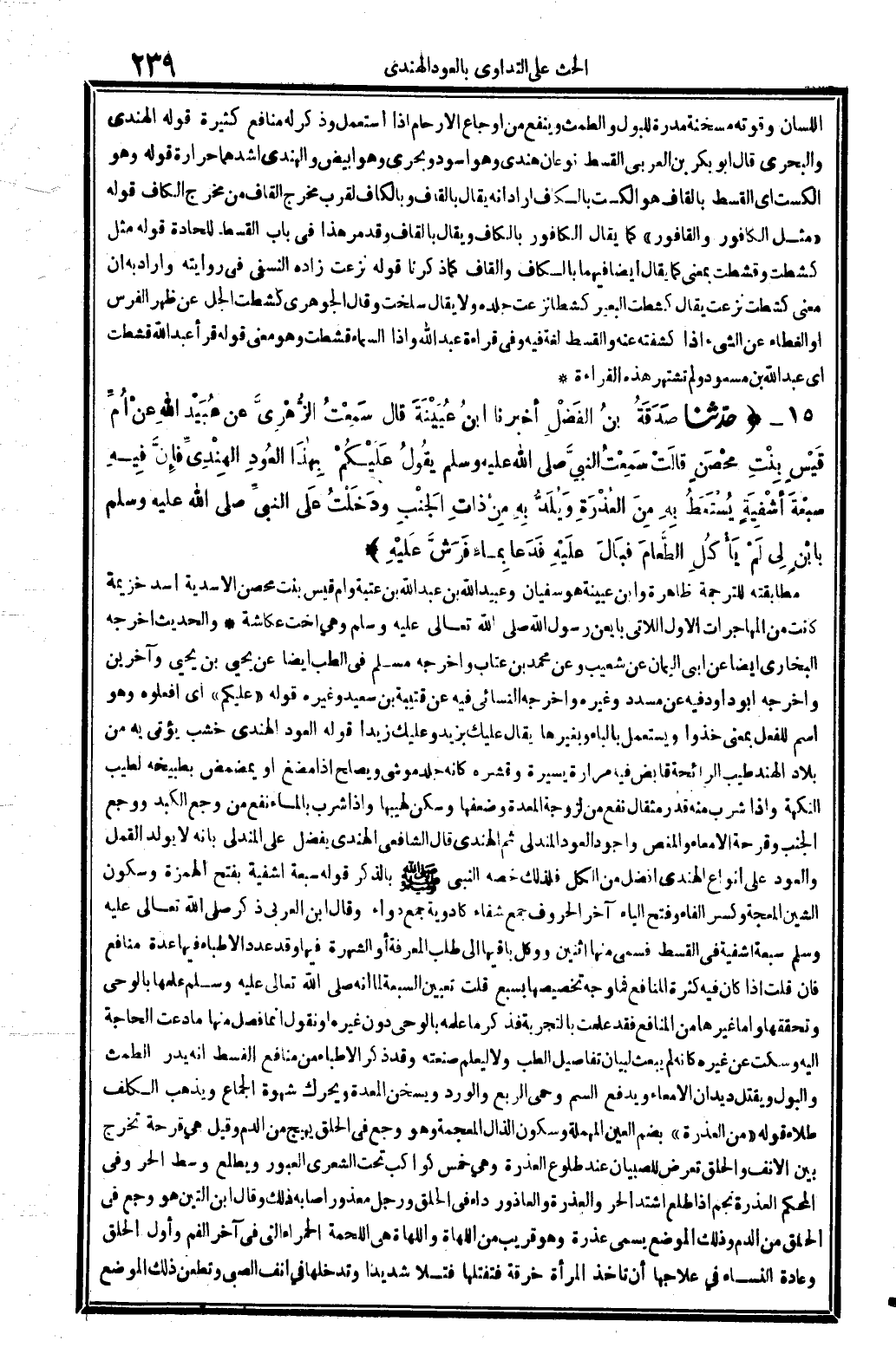 5692 - حدّثنا صَدَقَةُ بنُ الفَضْلِ أخبرنَا ابنُ عُيَيْنَةَ قَالَ: سَمِعْتُ الزُّهْرِيَّ عَن عُبَيْد الله عنْ أُمِّ قَيْسٍ بِنْتِ محْصَنٍ، قالَتْ: سَمِعْتُ النبيَّ صلى الله عَلَيْهِ وَسلم، يَقُولُ: عَلَيْكُم بِهاذَا العُودِ الهِنْدِيِّ فإنَّ فِيهِ سبْعَة أشْفِيَةٍ: يُسْتَعَطُ بِهِ مِنَ العُذْرَةِ وَيُلَدُّ بِهِ مِن ذاتِ الجَنْبِ. ودَخَلْتُ عَلى النبيِّ صلى الله عَلَيْهِ وَسلم، بابْنٍ لِي لَمْ يَأْكُلِ الطَّعامَ فبَالَ علَيْهِ فَدَعَا بِماءٍ فَرَشَّ عَلَيْهِ. (انْظُر الحَدِيث 223) .