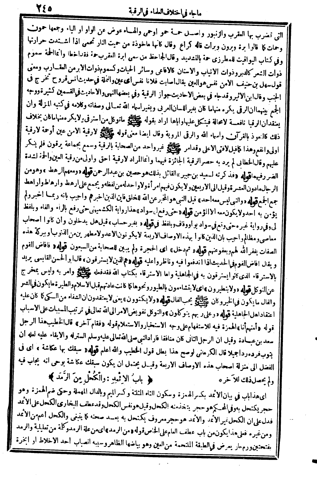 الَّتِي تضرب بهَا الْعَقْرَب والزنبور، وأصل حمة حمو أَو حمى، وَالْهَاء عوض عَن الْوَاو أَو الْيَاء وَجَمعهَا: حمون وحمات، كَمَا قَالُوا برة وبرون وبرأت، قَالَه كرَاع. وَقَالَ: كَأَنَّهَا مَأْخُوذَة من حميت النَّار تحمى إِذا اشتدت حَرَارَتهَا، وَفِي (كتاب اليواقيت) للمطرزي: حمة بِالتَّشْدِيدِ، وَقَالَ الجاحظ: من سمى إبرة الْعَقْرَب حمة فقد أَخطَأ، وَإِنَّمَا الْحمة سموم ذَوَات الشّعْر: كالدبر وَذَوَات الأنياب والأسنان كالأفاعي وَسَائِر الْحَيَّات، وكسموم ذَوَات الإبر من العقارب، وَمعنى قَول سهل بن حنيف: إلاَّ من نفس، هُوَ الْعين يُقَال: أَصَابَت فلَانا نفس أَي: عين، والنملة فِي حَدِيث أنس قُرُوح تخرج فِي الْجنب، وَقَالَ ابْن الْأَثِير: وَقد جَاءَ فِي بعض الْأَحَادِيث جَوَاز الرّقية، وَفِي بَعْضهَا النَّهْي. وَالْأَحَادِيث فِي الْقسمَيْنِ كَثِيرَة، وَوجه الْجمع بَينهمَا أَن الرقى يكره مِنْهَا مَا كَانَ بِغَيْر اللِّسَان الْعَرَبِيّ وَبِغير أَسمَاء الله تَعَالَى وَصِفَاته وَكَلَامه فِي كتبه الْمنزلَة، وَأَن يعْتَقد أَن الرقيا نافعة لَا محَالة فيتكل عَلَيْهَا، وَإِيَّاهَا أَرَادَ بقوله صلى الله عَلَيْهِ وَسلم: مَا توكل من استرقى، وَلَا يكره مِنْهَا مَا كَانَ بِخِلَاف ذَلِك كالتعوذ بِالْقُرْآنِ وَأَسْمَاء الله والرقى المروية، وَقَالَ أَيْضا: معنى قَوْله صلى الله عَلَيْهِ وَسلم: لَا رقية إلاَّ من عين أَو حمة، لَا رقية أولى وأنفع، وَهَذَا كَمَا قيل: لَا فَتى إِلَّا عَليّ، وَقد أَمر صلى الله عَلَيْهِ وَسلم غير وَاحِد من الصَّحَابَة بالرقية، وَسمع بِجَمَاعَة يرقون فَلم يُنكر عَلَيْهِم. وَقَالَ الْخطابِيّ: لم يرد بِهِ حصر الرّقية الْجَائِزَة فيهمَا، وَإِنَّمَا المُرَاد: لَا رقية أَحَق وَأولى من رقية الْعين والحمة لشدَّة الضَّرَر فيهمَا. قَوْله: (فَذَكرته لسَعِيد بن جُبَير) الْقَائِل بذلك هُوَ حُصَيْن بن عبد الرَّحْمَن. قَوْله: (وَمَعَهُمْ الرَّهْط) وَهُوَ من الرِّجَال مَا دون الْعشْرَة. وَقيل: إِلَى الْأَرْبَعين، وَلَا يكون فيهم امْرَأَة وَلَا وَاحِد لَهُ من لَفظه، وَيجمع على أرهط وأرهاط، وأراهط جمع الْجمع. قَوْله: (وَالنَّبِيّ لَيْسَ مَعَه أحد) قيل: النَّبِي هُوَ الْمخبر عَن الله لِلْخلقِ فَأَيْنَ الَّذين أخْبرهُم؟ وَأجِيب: بِأَنَّهُ رُبمَا أخبروا لم يُؤمن بِهِ أحد وَلَا يكون مَعَه إلاَّ الْمُؤمن. قَوْله: (حَتَّى رفع لي سَواد) هَذَا رِوَايَة الْكشميهني: حَتَّى رفع، بالراء وَالْفَاء وبلفظ لي، وَفِي رِوَايَة غَيره: حَتَّى وَقع فِي سَواد، بواو وقاف وبلفظ: فِي قَوْله: (بِغَيْر حِسَاب) قيل: هَل يدْخلُونَ وَإِن كَانُوا أَصْحَاب معاصي ومظالم؟ وَأجِيب: بِأَن الَّذين كَانُوا بِهَذِهِ الْأَوْصَاف الْأَرْبَعَة لَا يكونُونَ إلاَّ عُدُولًا مطهرين من الذُّنُوب، أَو ببركة هَذِه الصِّفَات يغْفر الله لَهُم وَيَعْفُو عَنْهُم. قَوْله: (ثمَّ دخل) أَي: الْحُجْرَة وَلم يبين للصحابة من السبعون. قَوْله: (فَأَفَاضَ الْقَوْم) وَيُقَال: أَفَاضَ الْقَوْم فِي الحَدِيث إِذا انْدَفَعُوا فِيهِ وناظروا عَلَيْهِ. قَوْله: (هم الَّذين لَا يسْتَرقونَ) قَالَ أَبُو الْحسن الْقَابِسِيّ: يُرِيد بالاسترقاء الَّذِي كَانُوا يسْتَرقونَ بِهِ فِي الْجَاهِلِيَّة، غ وَأما الاسترقاء بِكِتَاب الله فقد فعله صلى الله عَلَيْهِ وَسلم وَأمر بِهِ وَلَيْسَ بمخرج عَن التَّوَكُّل. قَوْله: (وَلَا يَتَطَيَّرُونَ) أَي: لَا يتشاءمون بالطيور وَنَحْوهَا كَمَا كَانَت عَادَتهم قبل الْإِسْلَام، والطيرة مَا يكون فِي الشَّرّ والفأل مَا يكون فِي الْخَيْر، وَكَانَ صلى الله عَلَيْهِ وَسلم يحب الفأل. قَوْله: (وَلَا يَكْتَوُونَ) يَعْنِي: لَا يَعْتَقِدُونَ أَن الشِّفَاء من الكي كَمَا كَانَ عَلَيْهِ اعْتِقَاد أهل الْجَاهِلِيَّة. قَوْله: (وعَلى رَبهم يَتَوَكَّلُونَ) والتوكل تَفْوِيض الْأَمر إِلَى ا