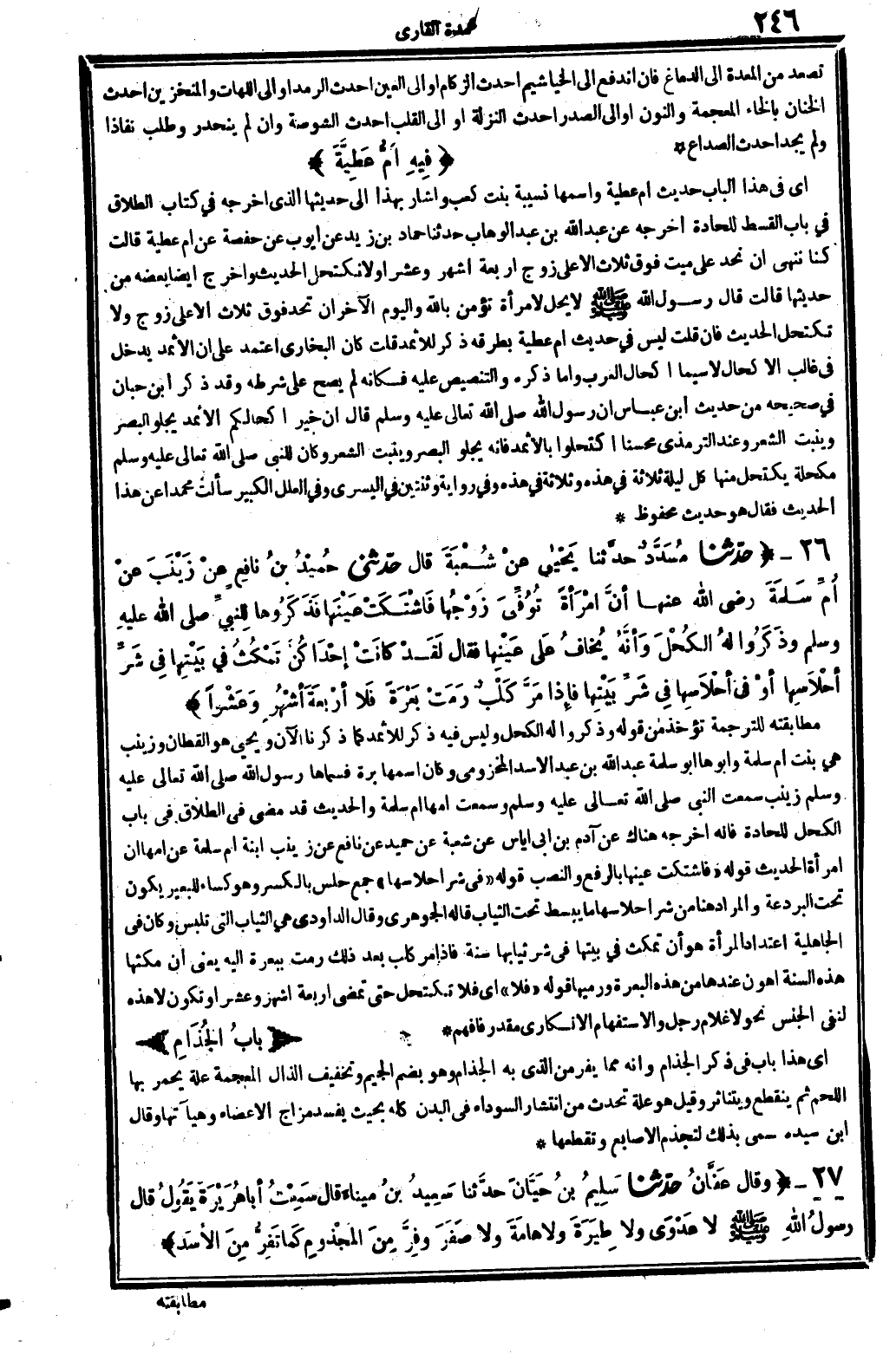 أَي: فِي هَذَا الْبَاب حَدِيث أم عَطِيَّة، وَاسْمهَا نسيبة بنت كَعْب، وَأَشَارَ بِهَذَا إِلَى حَدِيثهَا الَّذِي أخرجه فِي كتاب الطَّلَاق فِي: بَاب الْقسْط للحادة، أخرجه عَن عبد الله بن عبد الْوَهَّاب حَدثنَا حَمَّاد بن زيد عَن أَيُّوب عَن حَفْصَة عَن أم عَطِيَّة، قَالَت: كُنَّا ننهى أَن نحد على ميت فَوق ثَلَاث إلاَّ على زوج أَرْبَعَة أشهر وَعشرا، وَلَا نكتحل الحَدِيث وَأخرج أَيْضا بعضه من حَدِيثهَا، قَالَت: قَالَ رَسُول الله صلى الله عَلَيْهِ وَسلم: لَا يحل لامْرَأَة تؤمن بِاللَّه وَالْيَوْم الآخر أَن تحد فَوق ثَلَاث إلاَّ على زوج وَلَا تكتحل الحَدِيث. فَإِن قلت: لَيْسَ فِي حَدِيث أم عَطِيَّة بِطرقِهِ ذكر للإثمد! قلت: كَأَن البُخَارِيّ اعْتمد على أَن الإثمد يدْخل فِي غَالب الأكحال لاسيما أكحال الْعَرَب، وَأما ذكره والتنصيص عَلَيْهِ فَكَأَنَّهُ لم يَصح على شَرطه، وَقد ذكر ابْن حبَان فِي (صَحِيحه) من حَدِيث ابْن عَبَّاس: أَن رَسُول الله صلى الله عَلَيْهِ وَسلم، قَالَ: إِن خير أكحالكم الإثمد يجلو الْبَصَر وينبت الشّعْر، وَعند التِّرْمِذِيّ محسناً: اكتحلوا بالإثمد فَإِنَّهُ يجلو الْبَصَر وينبت الشّعْر، وَكَانَ للنَّبِي صلى الله عَلَيْهِ وَسلم مكحلة يكتحل مِنْهَا كل لَيْلَة ثَلَاثَة فِي هَذِه وَثَلَاثَة فِي هَذِه، وَفِي رِوَايَة: وثنتين فِي الْيُسْرَى، وَفِي (الْعِلَل الْكَبِير) : سَأَلت مُحَمَّدًا عَن هَذَا الحَدِيث فَقَالَ: هُوَ حَدِيث مَحْفُوظ.
