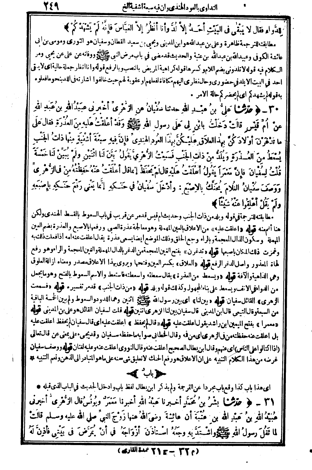 5713 - حدّثنا عَلِيُّ بنُ عبْدِ الله حَدثنَا سُفْيانُ عنِ الزُّهْرِيِّ أخْبرِني عَبَيْدُ الله بنُ عَبْدِ الله عنْ أُُمِّ قَيْسٍ، قالَتْ: دَخَلْتُ بابْنٍ لِي عَلَى رسولِ الله صلى الله عَلَيْهِ وَسلم وَقَدْ أعْلقْتُ عَليهِ مِنَ العُذْرَةِ، فقالَ: عَلَى مَا تدْغَرْنَ أوْلادَكُنَّ بِهاذا العلاَقِ؟ عَليْكُنَّ بِهاذَا العُودِ الهِندِيِّ فإِنَّ فِيهِ سبْعَةَ أشْفِيَةٍ مِنْها ذاتُ الجَنْبِ يُسْعَطُ مِنَ العُذْرَةِ وَيُلَدُّ مِنْ ذاتِ الجَنْبِ، فَسَمِعْتُ الزُّهْرِيَّ يَقُولُ: بَيَّنَ لَنا اثْنَيْنِ ولَمْ يُبَيِّنْ لَنا خَمْسَةً. قُلْتُ لِسُفْيانَ: فإِنَّ مَعْمَراً يَقُولُ: أعْلَقْتُ عَلَيْهِ. قَالَ: لَمْ يَحْفَظْ، إِنَّمَا قَالَ: أعْلَقْتُ عَنْهُ حَفِظتُهُ مِنْ فِي الزُّهْرِيِّ، وَوَصَفَ سُفْيانُ الغُلامَ يُحَنَّكُ بالإِصْبَعِ. وأدْخَلَ سُفْيانُ فِي حَنَكِهِ إنَّما يَعْني رَفْعَ حَنَكِهِ بإِصْبَعِهِ ولَمْ يَقُلْ: اعْلِقُوا عَنْهُ شَيْئاً.
