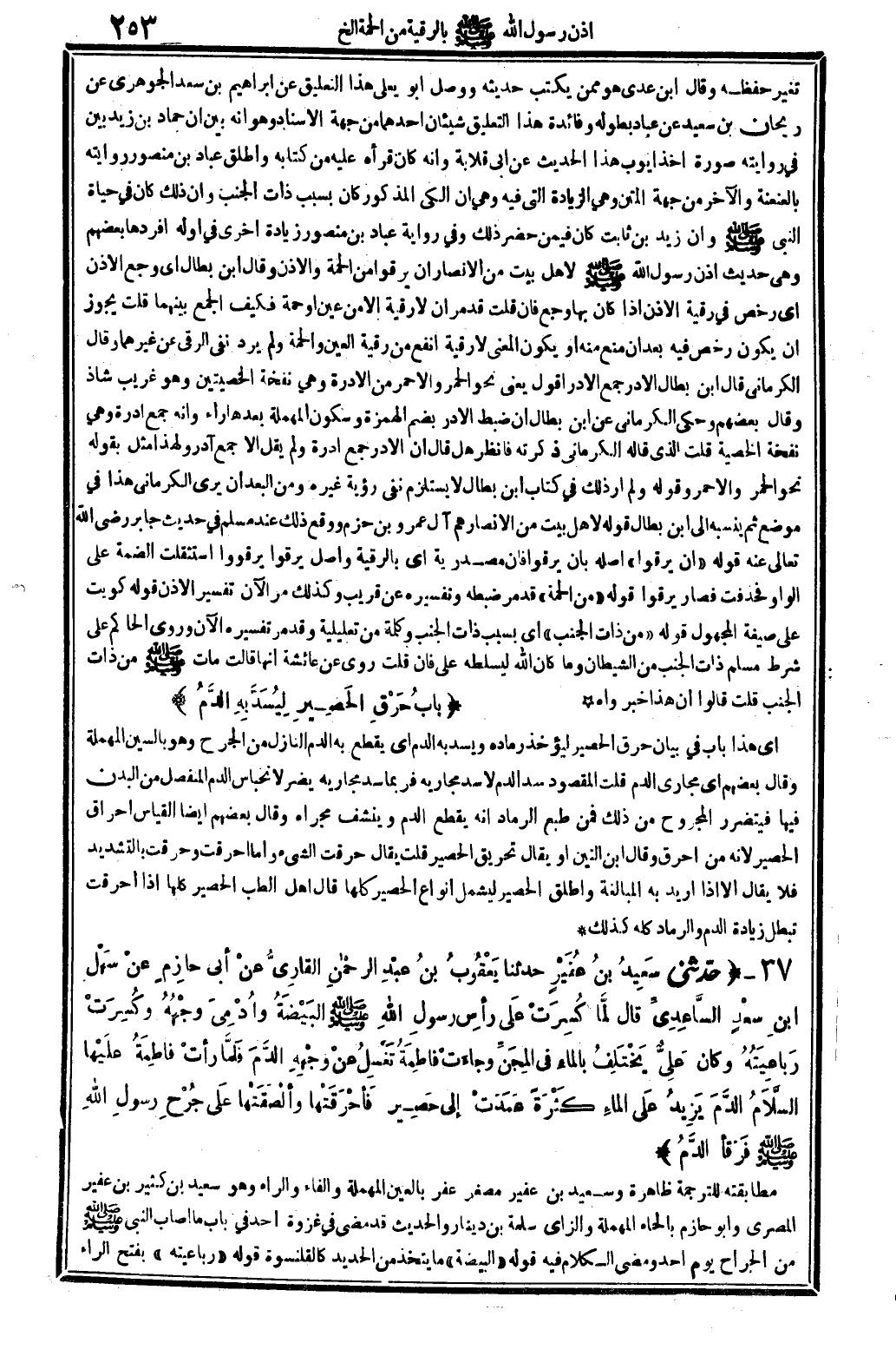 6722 - حدّثني سعَيدُ بنُ عُفَيْرٍ حَدثنَا يَعْقُوبُ بنُ عبْدِ الرحْمانِ القارِيُّ عنْ أبي حارِمٍ عنْ سَهْل بنِ سعْدٍ السَّاعِدِي قَالَ: لمَّا كُسِرَتْ علَى رأسِ رسولِ الله صلى الله عَلَيْهِ وَسلم البَيْضَةُ وَأُدْمِيَ وجْهُهُ وكُسِرَتْ رَباعِيَتُهُ، وَكَانَ عَلِيٌّ يَخْتَلِفُ بالماءِ فِي المِجَنِّ، وجاءَتْ فاطِمَةُ تَغْسِلُ عنْ وجْهِهِ الدَّمَ، فَلَمَّا رأتْ فاطِمَةُ، علَيْها السَّلاَمُ، الدَّمَ يَزِيدُ عَلى الماءِ كَثْرَةً عَمَدَتْ إِلَى حَصِير فأحْرَقَتْها وألْصَقَتْها علَى جُرْحِ رسولِ الله صلى الله عَلَيْهِ وَسلم فَرَقأ الدَّمُ.