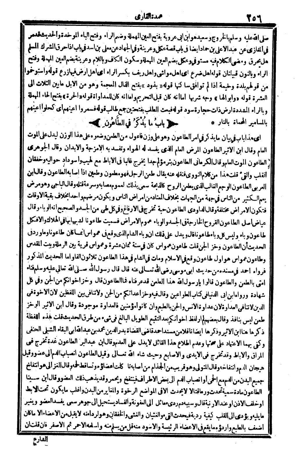 وَمَا ورد فِي الحَدِيث: أَن الطَّاعُون وخز الْجِنّ. قلت: طاعون عمواس كَانَ فِي سنة ثَمَان عشرَة، وعمواس قَرْيَة بَين الرملة وَبَيت الْمُقَدّس، وطاعون عمواس هُوَ أول طاعون وَقع فِي الْإِسْلَام وَمَات فِي الشَّام فِي هَذَا الطَّاعُون ثَلَاثُونَ ألفا. وَأما الحَدِيث الْمَذْكُور فَرَوَاهُ أَحْمد فِي (مُسْنده) من حَدِيث أبي مُوسَى رَضِي الله عَنهُ قَالَ: قَالَ رَسُول الله صلى الله عَلَيْهِ وَسلم: فنَاء أمتِي بالطعن والطاعون. قَالُوا: يَا رَسُول الله! هَذَا الطعْن قد عَرفْنَاهُ، فَمَا الطَّاعُون؟ قَالَ: وخز إخْوَانكُمْ من الْجِنّ، وَفِي كل شَهَادَة. وَرَوَاهُ ابْن أبي الدُّنْيَا فِي (كتاب الطواعين) وَقَالَ فِيهِ: وخز أعدائكم من الْجِنّ، وَلَا تنَافِي بَين اللَّفْظَيْنِ لِأَن الْأُخوة فِي الدّين لَا تنَافِي الْعَدَاوَة لِأَن عَدَاوَة الْإِنْس وَالْجِنّ بالطبع، وَإِن كَانُوا مُؤمنين فالعداوة مَوْجُودَة. وَقَالَ ابْن الْأَثِير: الوخز طعن لَيْسَ بنافذ، وَقَالَ بَعضهم: لم أر لفظ: إخْوَانكُمْ، بعد التتبع الطَّوِيل الْبَالِغ فِي شَيْء من طرق الحَدِيث. قلت: هَذِه اللَّفْظَة ذكرهَا هُنَا ابْن الْأَثِير وَذكرهَا أَيْضا نَاقِلا من (مُسْند أَحْمد) قَاضِي الْقُضَاة بدر الدّين مُحَمَّد بن عبد الله أبي الْبَقَاء الشبلي الْحَنَفِيّ، وَكفى بهما الِاعْتِمَاد على صِحَّتهَا، وَعدم اطلَاع هَذَا الْقَائِل لَا يدل على الْعَدَم. وَقَالَ ابْن عبد الْبر: الطَّاعُون غُدَّة تخرج فِي المراق والآباط، وَقد تخرج فِي الْأَيْدِي والأصابع وَحَيْثُ شَاءَ الله تَعَالَى، وَقيل: الطَّاعُون انصباب الدَّم إِلَى عُضْو، وَقيل: هيجان الدَّم وانتفاخه، وَقَالَ الْمُتَوَلِي: وَهُوَ قريب من الجذام من أَصَابَهُ تآكلت أعضاؤه وتساقط لَحْمه. وَقَالَ الْغَزالِيّ: هُوَ انتفاخ جَمِيع الْبدن من الدَّم مَعَ الْحمى، أَو انصباب الدَّم إِلَى بعض الْأَطْرَاف، فينتفخ ويحمر وَقد يذهب ذَلِك الْعُضْو. وَقَالَ ابْن سينا: الطَّاعُون مَادَّة سميَّة تحدث ورماً قتالاً لَا يحدث إلاَّ فِي الْمَوَاضِع الرخوة والمغاير من الْبدن، وأغلب مَا يكون تَحت الْإِبِط أَو خلف الْأذن أَو عِنْد الأرنبة، قَالَ: وَسَببه دم رَدِيء مائل إِلَى العفونة وَالْفساد يَسْتَحِيل إِلَى جَوْهَر سمي يفْسد الْعُضْو ويغير مَا يَلِيهِ وَيُؤَدِّي إِلَى الْقلب كَيْفيَّة ردية فَيحدث الْقَيْء والغثيان والغشي والخفقان، وَهُوَ لرداءته لَا يقبل من الْأَعْضَاء إلاَّ مَا كَانَ أَضْعَف بالطبع، وأردؤه مَا يَقع فِي الْأَعْضَاء الرئيسة، وَالْأسود مِنْهُ قل من يسلم مِنْهُ، وأسلمه الْأَحْمَر ثمَّ الْأَصْفَر، فَإِن قلت إِن