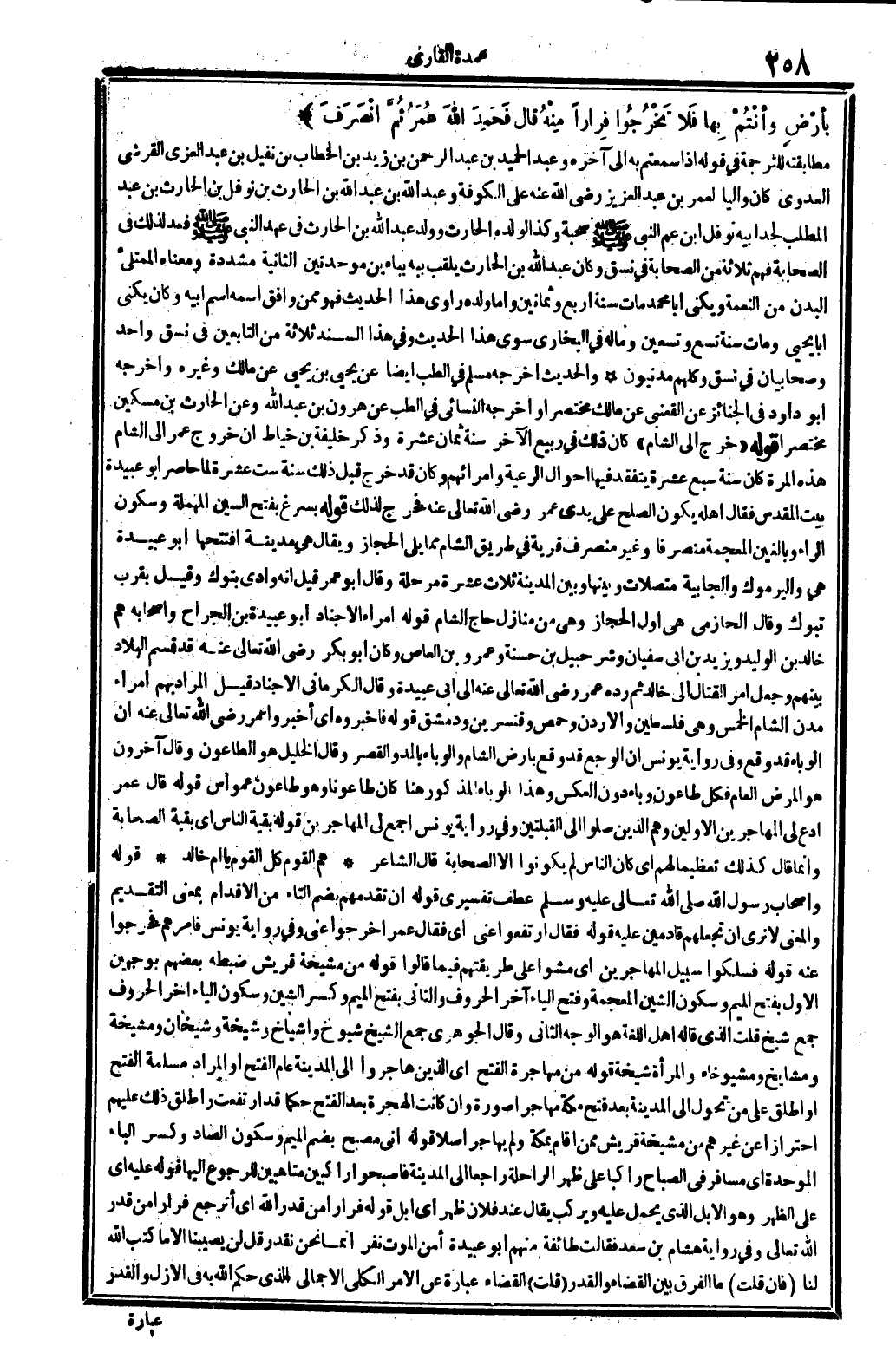 بأرْضٍ وأنْتُمْ بِها فَلا تَخْرُجُوا فِراراً مِنْهُ، قَالَ: فَحَمِدَ الله عُمَرُ ثُمَّ انْصَرَفَ. (