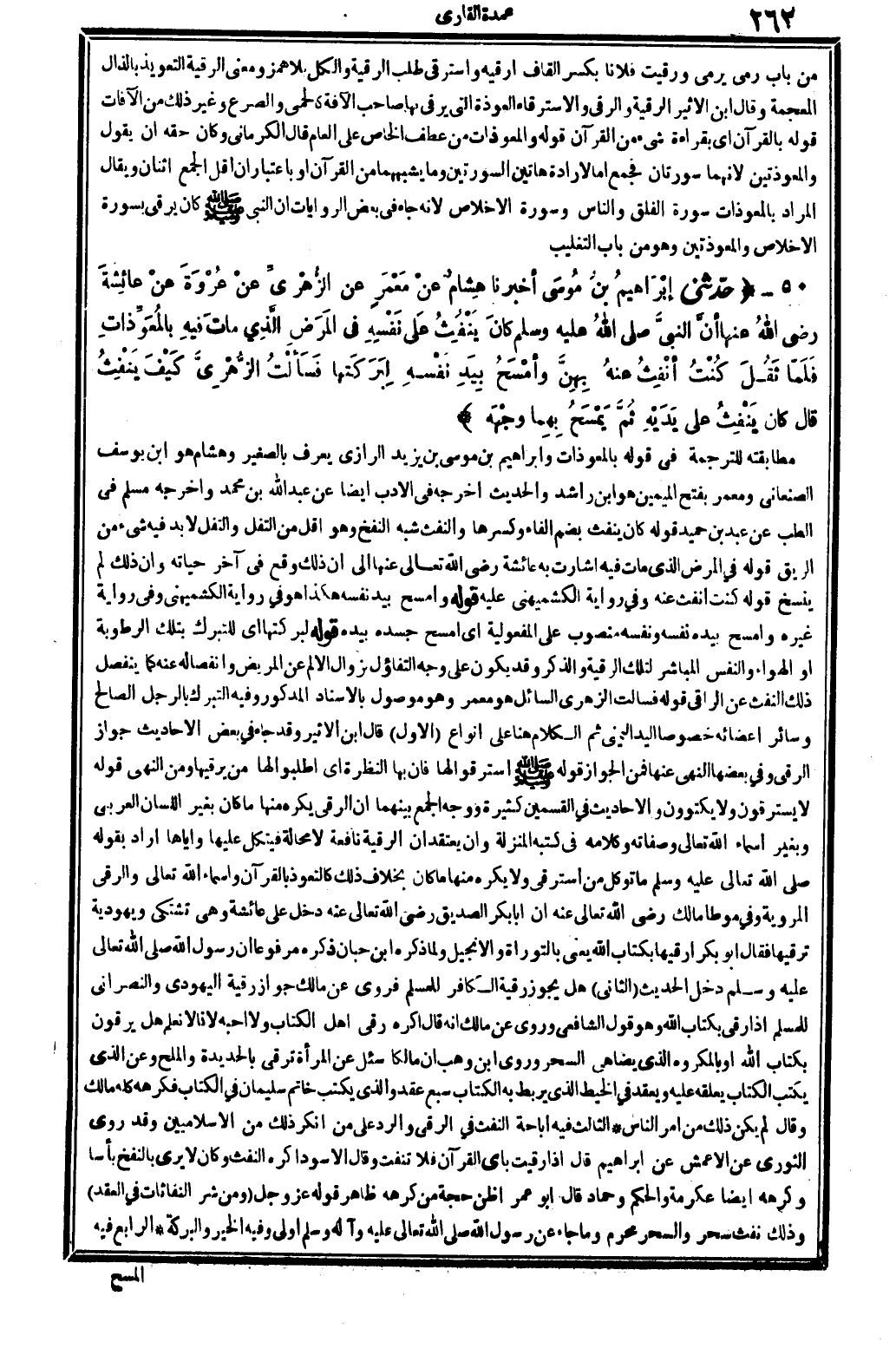 5735 - حدّثني إبْرَاهيمُ بنُ مُوسَى أخبرنَا هِشامٌ عنْ مَعْمَرٍ عَن الزُّهْريِّ عنْ عُرْوَةَ عنْ عائِشَةَ رَضِي الله عَنْهَا أنَّ النبيَّ صلى الله عَلَيْهِ وَسلم، كانَ يَنْفُثُ عَلى نَفْسِهِ فِي المَرَضِ الَّذِي ماتَ فيهِ بالمُعَوِّذاتِ، فَلَمّا ثَقُلَ كُنْتُ أنْفِثُ عنهُ بِهِنَّ، وأمْسَحُ بِيَدِ نَفْسِهِ لِبَرَكَتها.