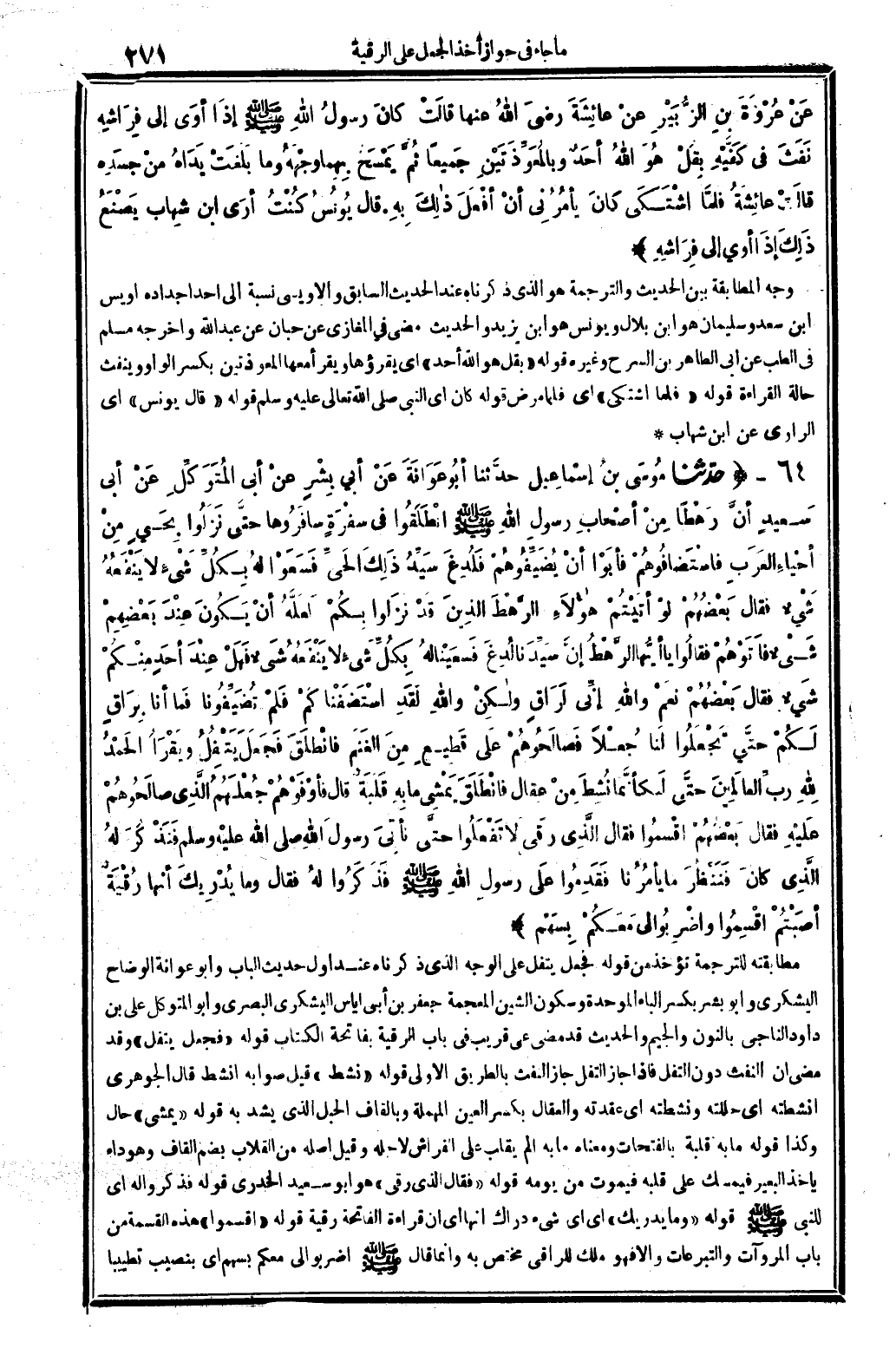 5749 - حدّثنا مُوسَى بنُ إسْماعِيل حدَّثنا أبُو عَوَانَةَ عَنْ أبي بِشْرٍ عنْ أبي المُتَوَكِّلِ عَنْ أبي سَعيدٍ أنَّ رَهْطاً مِنْ أصْحابِ رسولِ الله صلى الله عَلَيْهِ وَسلم انْطَلَقُوا فِي سفْرَةٍ سافَرُوها حتَّى نَزَلُوا بِحَيٍ مِنْ أحْياءٍ العَرَبِ، فاسْتَضافُوهُمْ فأبَوْا أنْ يُضَيِّفُوهُمْ، فَلُدِغَ سَيِّدُ ذَلِكَ الحَيِّ فَسَعَوْا لهُ بِكُلَ شَيْءٍ لَا يَنْفَعُهُ شَيْءٌ، فَقَالَ بَعْضُهُمْ: لوْ أتَيْتُمْ هاؤُلاَءِ الرَّهْطَ الذِينَ قَدْ نزَلوا بِكُمْ لَعَلَّهُ أنْ يَكُونَ عِنْدَ بَعْضِهِمْ شَيْءٌ، فأَتَوْهُمْ فقالُوا: يَا أيُّها الرَّهْطُ إنَّ سَيِّدَنا لُدِغَ فَسعَيْنا لهُ بِكُلِّ شَيءٍ لَا يَنْفَعُهُ شَيءٌ فَهَلْ عِنْدَ أحَدٍ مِنْكُمْ شَيءٌ؟ فقالَ بَعْضُهُمْ: نعَمْ، وَالله إنِّي لَرَاقٍ، ولاكِنْ وَالله لَقَدِ اسْتَضَفْناكَمْ فَلَمْ تُضَيِّفُونا فَما أَنا بِرَاقٍ لَكُمْ حتَّى تَجْعَلُوا لَنا جُعْلاً، فَصالَحُوهُمْ عَلى قَطِيعٍ مِنَ الغَنَم، فانْطلَقَ فَجَعَلَ يَتْفِلُ ويَقْرَأُ الحْمْدُ لله ربِّ العالَمِينَ حتَّى لَكأنَّما نُشِطَ مِنْ عِقال، فانْطَلَقَ يَمْشِي مَا بِهِ قَلَبَةٌ، قَالَ: فأوْفَوْهُمْ جُعْلَهُمُ الَّذي صالَحُوهُمْ عَليْهِ، فَقَالَ بَعْضُهُمْ: اقْسمُوا. فَقَالَ الَّذِي رَقى: لَا تَفْعَلُوا حتَّى نأتِيَ رسولَ الله صلى الله عَلَيْهِ وَسلم، فَنَذْكُرَ لهُ الَّذِي كانَ فَنَنْظُرَ مَا يأمُرُنا، فَقَدِمُوا عَلى رسولَ الله صلى الله عَلَيْهِ وَسلم فَذَكَرُوا لهُ، فَقَالَ: وَمَا يُدْرِيكَ أَنَّهَا رُقْيَةٌ؟ أصَبْتُمْ، اقْسِمُوا واضْرِبُوا لي مَعَكُمْ بِسَهْم.
