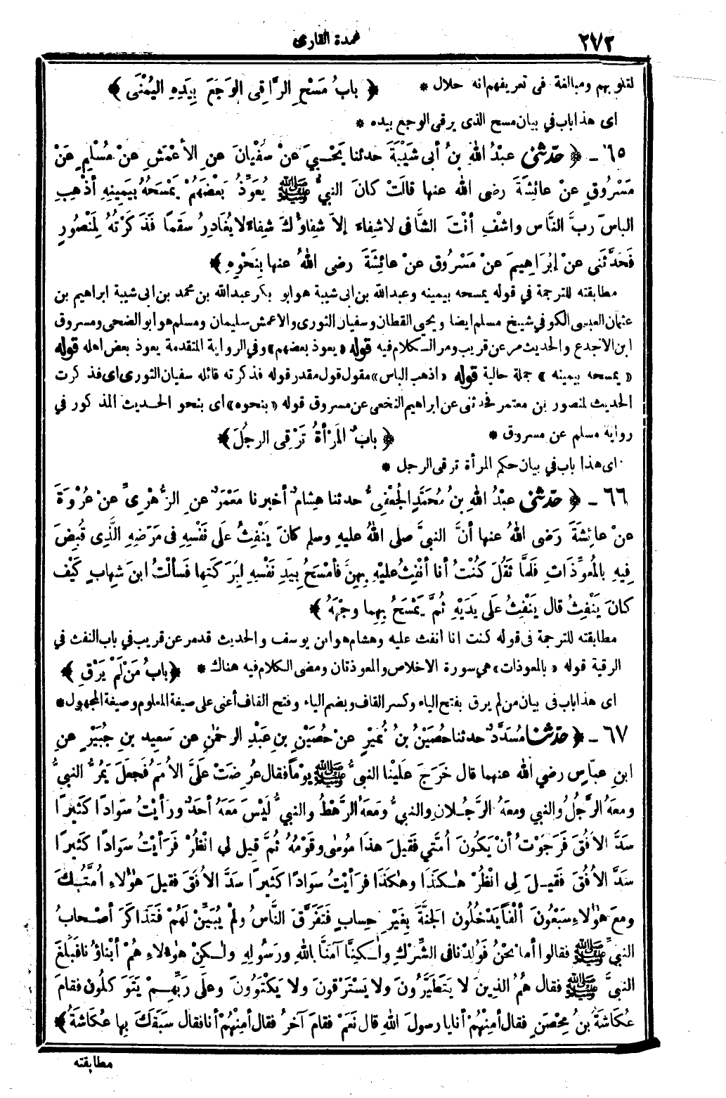 5750 - حدّثني عبْدُ الله بنُ أبي شَيْبَةَ حَدثنَا يَحْيَى عنْ سُفْيانَ عنِ الأعْمَشِ عنْ مُسْلِمٍ عَنْ مَسْرُوقٍ عنْ عائِشَةَ رَضِي الله عَنْهَا قالَتْ: كانَ النبيُّ صلى الله عَلَيْهِ وَسلم يُعَوِّذُ بَعْضَهُمْ يَمْسَحُهُ بيَمِينِهِ أذْهِبِ الباسَ ربَّ النَّاس واشْفِ أنْتَ الشَّافي لَا شِفاءً إلاّ شِفاؤُكَ شِفاءً لَا يُغَادِرُ سَقماً، فَذَكَرْتُهُ لِمَنْصُورٍ فَحَدَّثَني عنْ إبْرَاهِيمَ عنْ مَسْرُوق عنْ عائِشَةَ رَضِي الله عَنْهَا بِنَحْوِهِ.