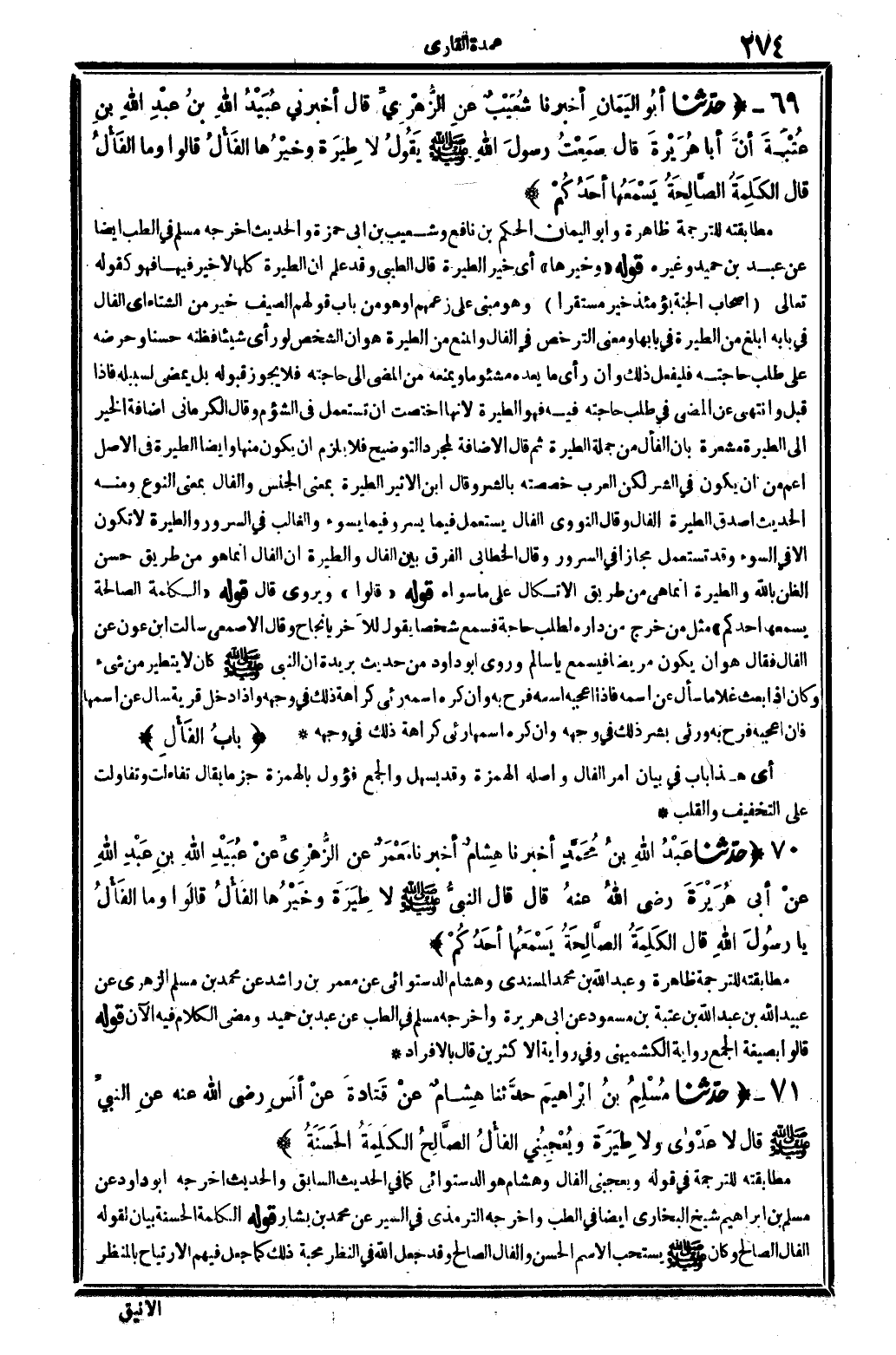 5754 - حدّثنا أبُو اليَمَانِ أخبرنَا شُعَيْبٌ عنِ الزُّهْرِيِّ قَالَ: أَخْبرنِي عُبَيْدُ الله بنُ عبْدِ الله بنِ عُتْبَةَ أنَّ أَبَا هُرَيْرَةَ قَالَ: سَمِعْتُ رسولَ الله صلى الله عَلَيْهِ وَسلم يَقُولُ: لَا طِيرَةَ وخيْرُها الفَأْلُ، قَالُوا: وَمَا الفَأْلُ؟ قَالَ: الكَلِمَةُ الصَّالِحَةُ يَسْمَعُها أحَدُكُمْ. (انْظُر الحَدِيث: 5754 طرفه فِي: 5755) .