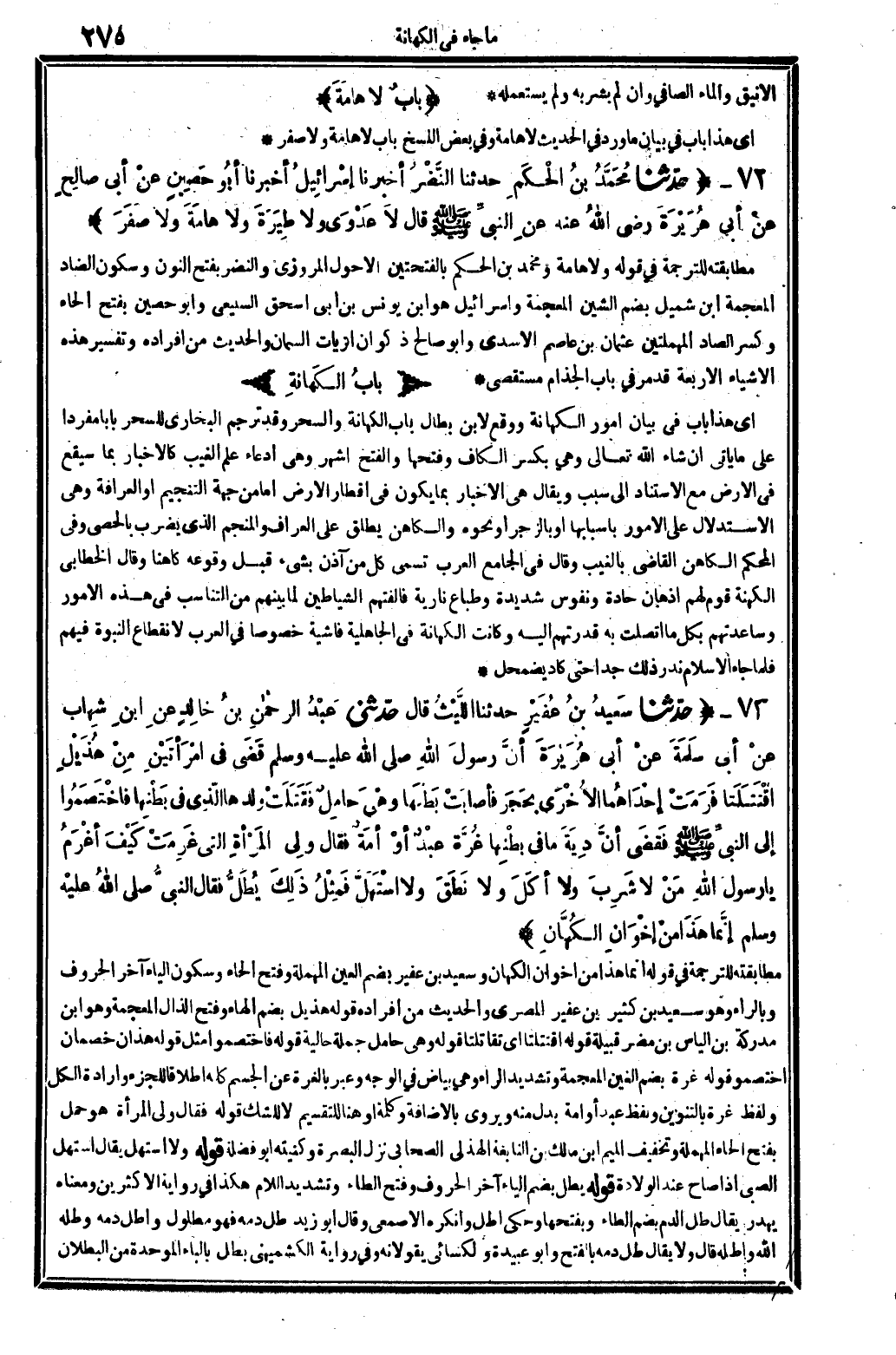 5758 - حدّثنا سَعيدُ بنُ عُفَيْرٍ حَدثنَا اللَّيْثُ قَالَ: حدّثني عَبْدُ الرحْمانِ بنُ خالِدٍ عنِ ابنِ شِهاب عنْ أبي سَلَمَةَ عنْ أبي هُرَيْرَةَ: أنَّ رسولَ الله صلى الله عَلَيْهِ وَسلم قَضَى فِي امْرَأتَيْنِ مِنْ هُذَيْلٍ اقْتَتَلَتا، فَرَمَتْ إحْدَاهُما الأُخْرَى بحَجَر فأصابَتْ بَطْنَها وهْيَ حامِلٌ فَقَتَلَتْ وَلَدهَا الّذي فِي بَطْنِها، فاخْتَصَمُوا إِلَى النبيِّ صلى الله عَلَيْهِ وَسلم فَقضَى أنَّ دِيَّةَ مَا فِي بطْنِها غُرَّة عبْدٌ أوْ أمَةٌ فَقَالَ ولِيُّ المَرْأةِ الَّتِي غَرِمَتْ: كَيْفَ أغْرَمُ يَا رَسُول الله مَنْ لَا شَرِبَ وَلَا أكَلَ وَلَا نَطَقَ وَلَا اسْتَهَلَّ؟ فَمِثْلُ ذَلِكَ يُطَلُّ. فَقَالَ النبيُّ صلى الله عَلَيْهِ وَسلم إنَّما هَذَا منْ إخْوَانِ الكُهَّانِ. .