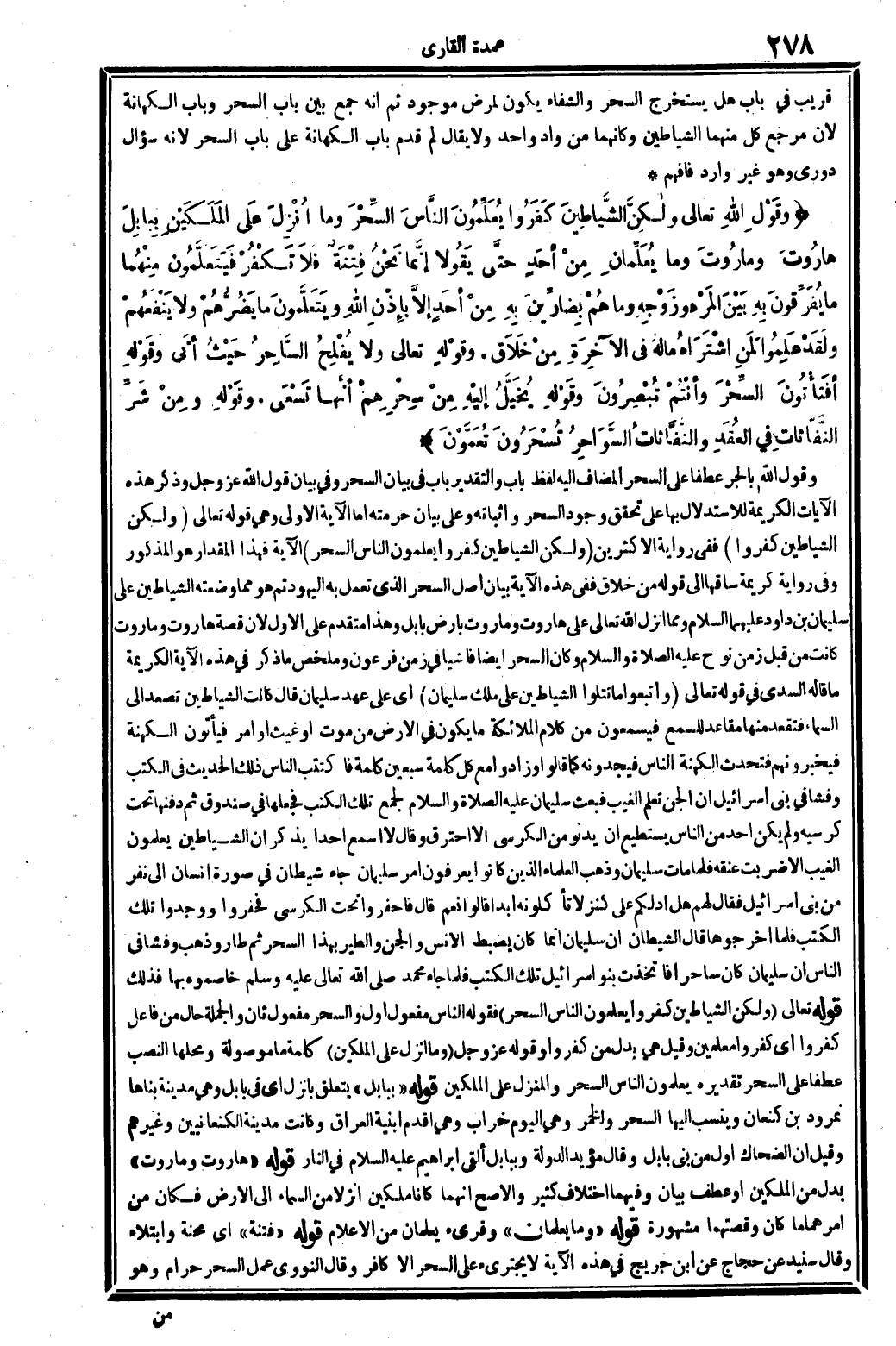 وَقَول الله بِالْجَرِّ عطفا على السحر الْمُضَاف إِلَيْهِ لفظ: بَاب، وَالتَّقْدِير: بَاب فِي بَيَان السحر وَفِي بَيَان قَول الله عز وَجل، وَذكر هَذِه الْآيَات الْكَرِيمَة للاستدلال بهَا على تحقق وجود السحر وإثباته، وعَلى بَيَان حرمته أما الْآيَة الأولى وَهِي قَوْله تَعَالَى {وَلَكِن الشَّيَاطِين كفرُوا} فَفِي رِوَايَة الْأَكْثَرين {وَلَكِن الشَّيَاطِين كفرُوا يعلمُونَ النَّاس السحر} ... الْآيَة فَهَذَا الْمِقْدَار هُوَ الْمَذْكُور، وَفِي رِوَايَة كَرِيمَة سَاقهَا إِلَى قَوْله {من خلاق} فَفِي هَذِه الْآيَة بَيَان أصل السحر الَّذِي تعْمل بِهِ الْيَهُود ثمَّ هُوَ مِمَّا وَضعته الشَّيَاطِين على سُلَيْمَان بن دَاوُد عَلَيْهِمَا السَّلَام وَمِمَّا أنزل الله تَعَالَى على هاروت وماروت بِأَرْض بابل وَهَذَا مُتَقَدم على الأول لِأَن قصَّة هاروت وماروت كَانَت من قبل زمن نوح عَلَيْهِ السَّلَام وَكَانَ السحر أَيْضا فاشياً فِي زمن فِرْعَوْن، وَمُلَخَّص مَا ذكر فِي هَذِه الْآيَة الْكَرِيمَة مَا قَالَه السّديّ فِي قَوْله تَعَالَى: {وَاتبعُوا مَا تتلوا الشَّيَاطِين على ملك سُلَيْمَان} أَي: على عهد سُلَيْمَان، قَالَ: كَانَت الشَّيَاطِين تصعد إِلَى السَّمَاء فتقعد مِنْهَا مقاعد للسمع فيسمعون من كَلَام الْمَلَائِكَة مَا يكون فِي الأَرْض من موت أَو غيث أَو أَمر، فَيَأْتُونَ الكهنة فَيُخْبِرُونَهُمْ فَتحدث الكهنة النَّاس فيجدونه كَمَا قَالُوا، وَزَادُوا مَعَ كل كلمة سبعين كلمة، فاكتتب النَّاس ذَلِك الحَدِيث فِي الْكتب وَفَشَا فِي بني إِسْرَائِيل: أَن الْجِنّ تعلم الْغَيْب، فَبعث سُلَيْمَان عَلَيْهِ السَّلَام لجمع تِلْكَ الْكتب فَجَعلهَا فِي صندوق ثمَّ دَفنهَا تَحت كرسيه وَلم يكن أحد من النَّاس يَسْتَطِيع أَن يدنو من الْكُرْسِيّ إلاَّ احْتَرَقَ. وَقَالَ: لَا أسمع أحدا يذكر أَن الشَّيَاطِين يعلمُونَ الْغَيْب إلاَّ ضربت عُنُقه، فَلَمَّا مَاتَ سُلَيْمَان وَذهب الْعلمَاء الَّذين كَانُوا يعْرفُونَ أَمر سُلَيْمَان جَاءَ شَيْطَان فِي صُورَة إِنْسَان إِلَى نفر من بني إِسْرَائِيل فَقَالَ لَهُم: هَل أدلكم على كنز لَا تأكلونه أبدا؟ قَالُوا: نعم. قَالَ: فاحفروا تَحت الْكُرْسِيّ، فَحَفَرُوا ووجدوا تِلْكَ الْكتب، فَلَمَّا أخرجوها قَالَ الشَّيْطَان: إِن سُلَيْمَان إِنَّمَا كَانَ يضْبط الْإِنْس وَالْجِنّ وَالطير بِهَذَا السحر، ثمَّ طَار وَذهب وَفَشَا فِي النَّاس أَن سُلَيْمَان كَانَ ساحراً، فاتخذت بَنو إِسْرَائِيل تِلْكَ الْكتب، فَلَمَّا جَاءَ مُحَمَّد صلى الله عَلَيْهِ وَسلم خاصموه بهَا فَذَلِك قَوْله: تَعَالَى: {وَلَكِن الشَّيَاطِين كفرُوا يعلمُونَ النَّاس السحر} فَقَوله: النَّاس: مفعول أول. وَالسحر مفعول ثَان، وَالْجُمْلَة حَال من فَاعل كفرُوا، أَي: كفرُوا معلمين، وَقيل: هِيَ بدل من كفرُوا. وَقَوله عز وَجل {وَمَا أنزل على الْملكَيْنِ} كلمة: مَا، مَوْصُولَة ومحلها النصب عطفا على السحر، تَقْدِيره يعلمُونَ النَّاس السحر والمنزل على الْملكَيْنِ. قَوْله: (بِبَابِل) يتَعَلَّق: بأنزل، أَي: فِي بابل وَهِي مَدِينَة بناها نمْرُود بن كنعان وينسب إِلَيْهَا السحر وَالْخمر، وَهِي الْيَوْم خراب، وَهِي أقدم أبنية الْعرَاق وَكَانَت مَدِينَة الكنعانيين وَغَيرهم. وَقيل: إِن الضَّحَّاك أول من بنى بابل، وَقَالَ مؤيد الدولة: وببابل ألْقى إِبْرَاهِيم عَلَيْهِ السَّلَام فِي النَّار. قَوْله: (هاروت وماروت) بدل من الْملكَيْنِ أَو عطف بَيَان وَفِيهِمَا اخْتِلَاف كثير، وَالأَصَح أَنَّهُمَا كَانَا ملكَيْنِ أنزلا من السَّمَاء إِلَى الأَرْض فَكَانَ من أَمرهمَا مَا كَانَ، وقصتهما مَشْهُورَة. قَوْله: (وَمَا يعلمَانِ) وقرىء: يعلمَانِ، من الْإِعْلَام. قَوْله: (فتْنَة) أَي: محنة وابتلاء، وَقَالَ سنيد عَن حجاج عَن ابْن جريج فِي هَذِه الْآيَة: لَا يجترىء على السحر إلاَّ كَافِر