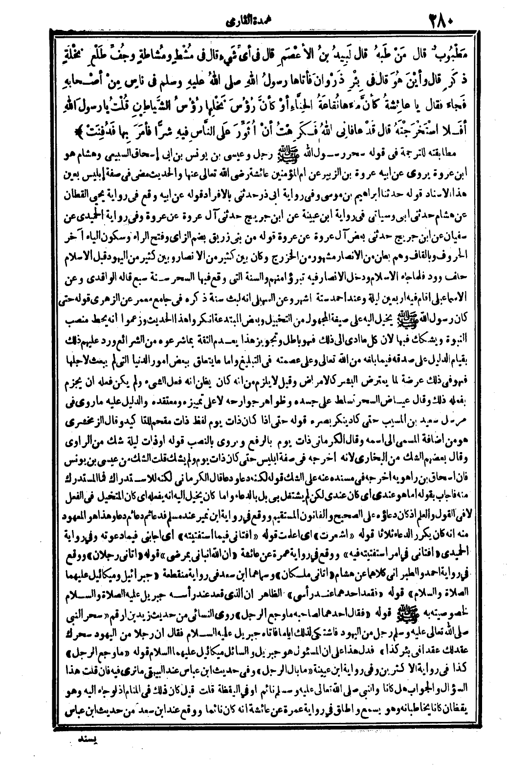 مَطْبُوبٌ. قَالَ: مَنْ طَبهُ؟ قَالَ: لَبِيدُ بنُ الأعْصَمِ. قَالَ: فِي أيِّ شَي؟ قَالَ: فِي مُشْطٍ ومُشاطةٍ وجُفِّ طَلْعِ نخْلَةٍ ذكَرٍ. قَالَ: وأيْنَ هُوَ؟ قَالَ: فِي بِئْرِ ذَرْوانَ، فَأَتَاهَا رسولُ الله صلى الله عَلَيْهِ وَسلم، فِي ناسِ مِنْ أصْحابِهِ فَجاءَ فَقَالَ: يَا عائِشةُ! كأنَّ ماءَها نُقاعَةُ الحِنَّاءِ أوْ: كأنَّ رُؤُوسَ نَخْلِها رُؤُوسُ الشَّياطِينِ قُلْتُ: يَا رسولَ الله أفَلا اسْتَخْرَجْتَهُ؟ قَالَ: قَدْ عافانِي الله فَكَرِهْتُ أنْ أُثَوِّرَ عَلى النَّاسِ فيهِ شرّاً، فأمَرَ بِها فَدُفِنَتْ.