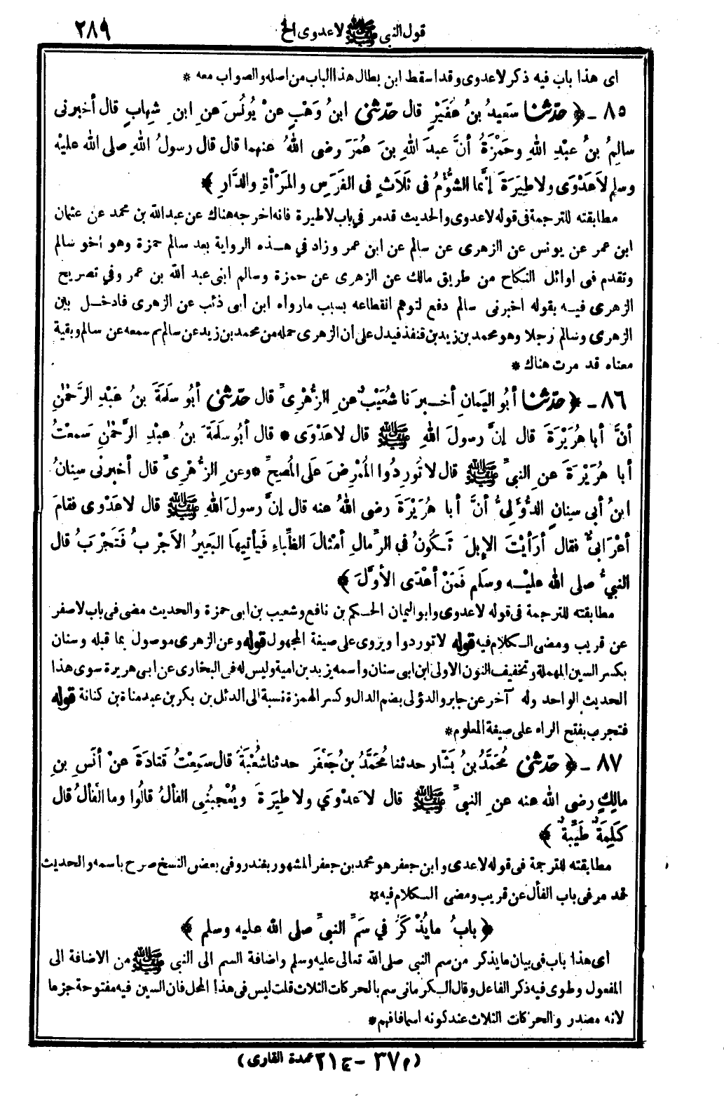 5772 - حدّثناسَعيدُ بنُ عُفَيْرٍ قَالَ: حدّثني ابنُ وَهْبٍ عنْ يُونُسَ عنِ ابنِ شِهابٍ قَالَ: أَخْبرنِي سالِمُ بنُ عبْدِ الله وحَمْزَةُ أنَّ عبدَ الله بنَ عُمَرَ رَضِي الله عَنْهُمَا قَالَ: قَالَ رسولُ الله صلى الله عَلَيْهِ وَسلم: لاَ عَدْوَى وَلَا طِيَرَةَ إنَّما الشُّؤْمُ فِي ثَلاَثٍ: فِي الفَرَسِ والمَرْأةِ والدَّارِ.