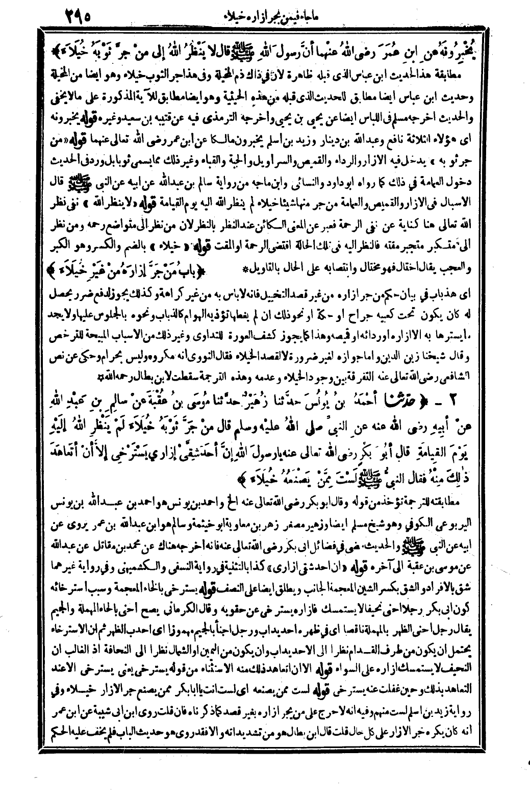 5784 - حدّثنا أحْمَدُ بنُ يُونُسَ حدَّثنا زُهَيْرٌ حدَّثنا مُوسَى بنُ عُقْبَةَ عنْ سالِمِ بنِ عَبْدِ الله عنْ أبِيهِ رَضِي الله عَنهُ عنِ النبيِّ صلى الله عَلَيْهِ وَسلم قَالَ: منْ جَرَّ ثَوْبَهُ خُيَلاَءَ لَمْ يَنْظرِ الله إلَيْهِ يَوْمَ القِيامَةِ، قَالَ أبُو بَكْرٍ رَضِي الله عَنهُ: يَا رسولَ الله! إنَّ أحَدَ شِقَّيْ إزَارِي يَسْتَرْخِي، إلاَّ أنْ أتَعاهَدَ ذالِكَ مِنْهُ فَقَالَ النبيُّ صلى الله عَلَيْهِ وَسلم لَسْتَ مِمَّنْ يَصْنَعُهُ خُيَلاَءَ.