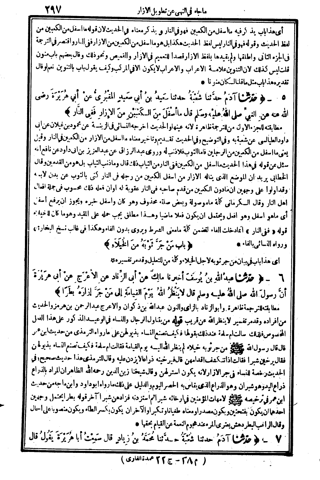 5787 - حدّثنا آدَمُ حدَّثنا شُعْبَةُ حَدثنَا سَعيدُ بنُ أبي سَعيدٍ المقْبُرِيُّ عنْ أبي هُرَيْرَةَ رَضِي الله عَنهُ عَن النبيِّ صلى الله عَلَيْهِ وَسلم قَالَ: مَا أسْفَلَ مِنَ الكَعْبَيْنِ منَ الإِِزارِ فَفِي النَّار.