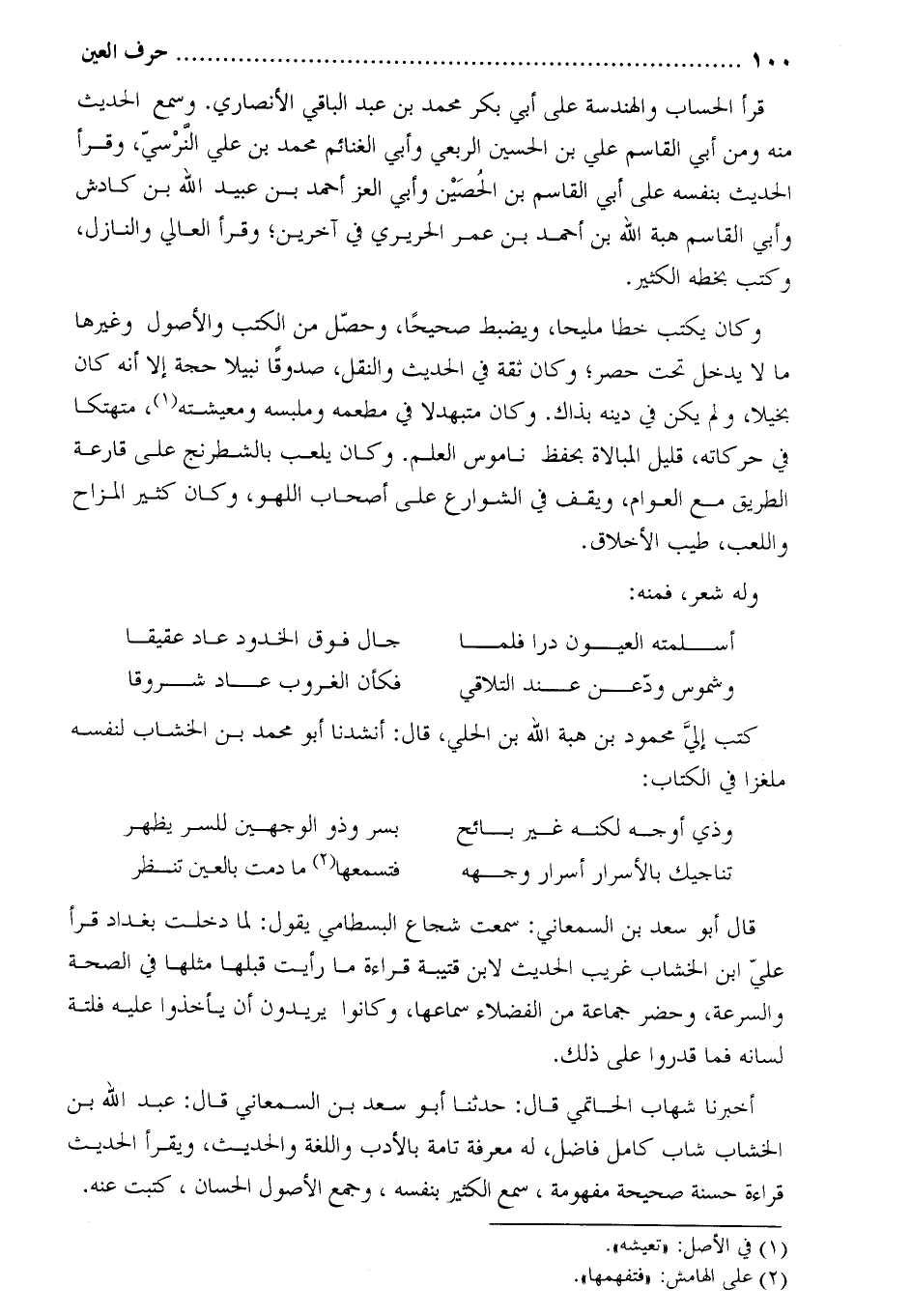 أخبرنا شهاب الحاتمي قال: حدثنا أبو سعد بن السمعاني قال: عبد الله بن الخشاب شاب كامل فاضل، له معرفة تامة بالأدب واللغة والحديث، ويقرأ الحديث قراءة حسنة صحيحة مفهومة، سمع الكثير بنفسه، وجمع الأصول الحسان، كتبت عنه.
