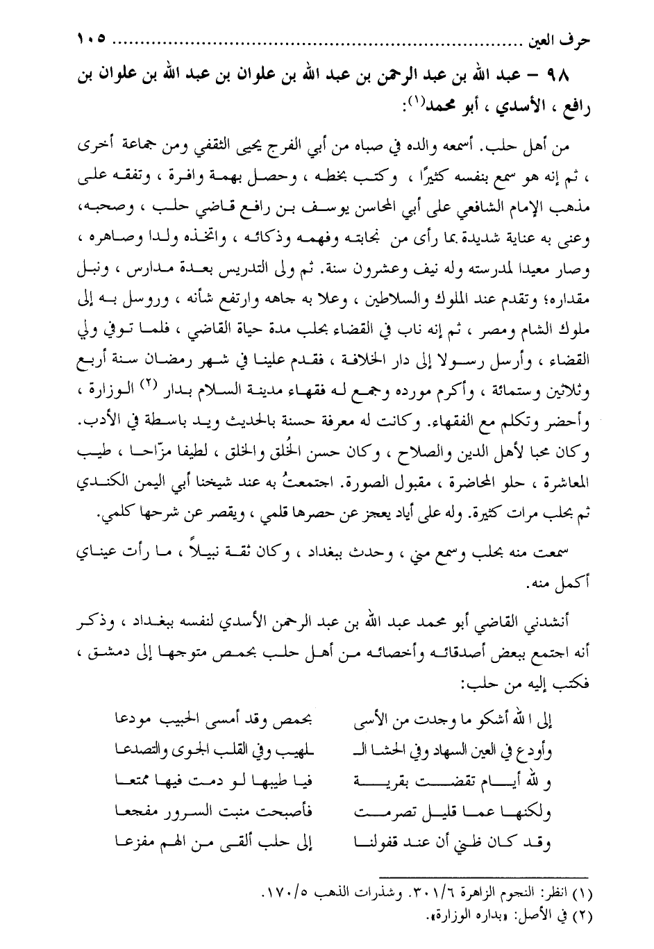 أنشدني القاضي أَبُو مُحَمَّدٍ عَبْدُ اللَّهِ بْنُ عَبْدِ الرَّحْمَنِ الأسدي لنفسه ببغداد، وذكر أنه اجتمع ببعض أصدقائه وأخصائه من أهل حلب بحمص متوجها إلى دمشق، فكتب إليه من حلب: