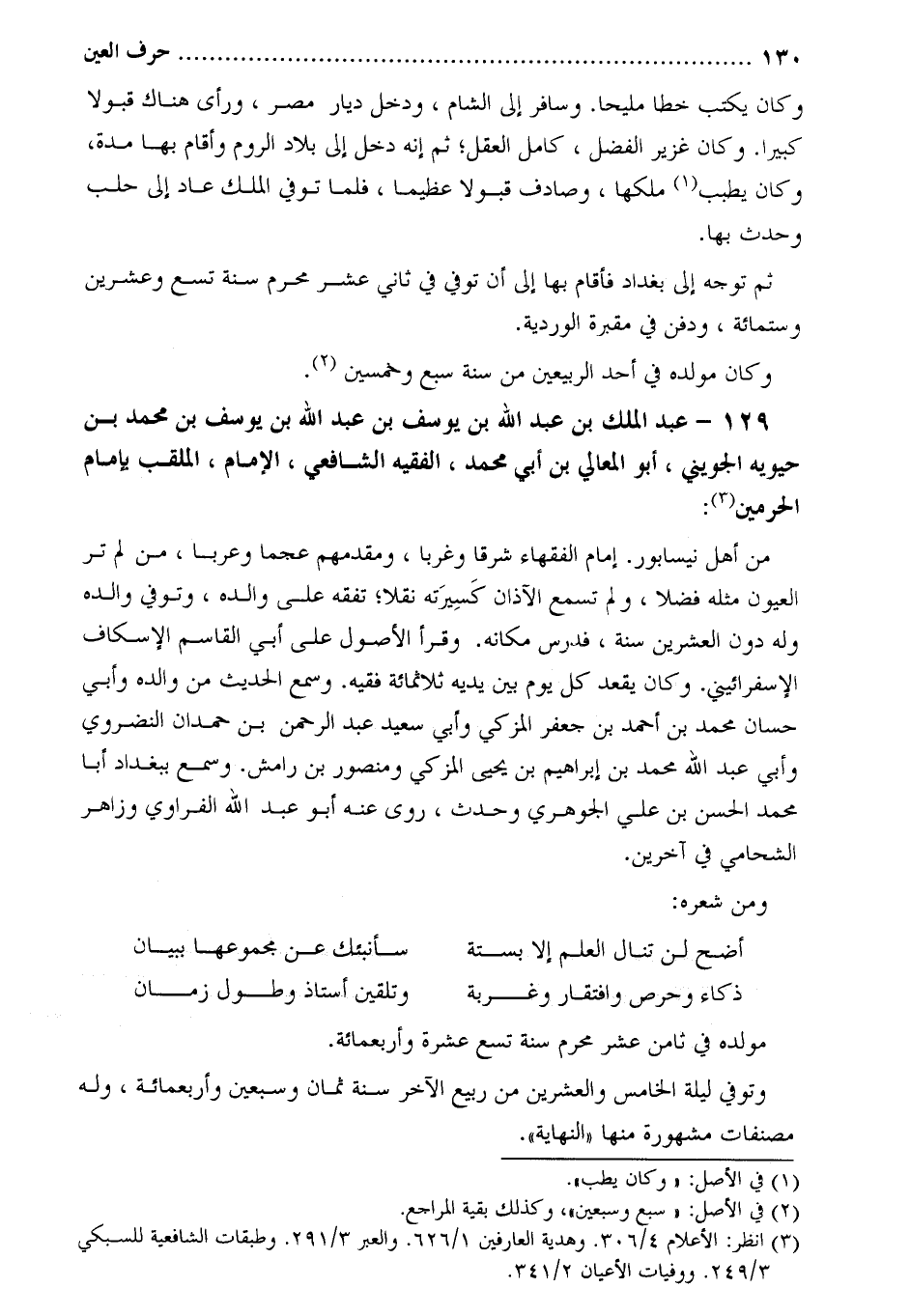 129- عبد الملك بن عبد اللَّه بن يوسف بن عبد اللَّه بن يوسف بن محمد بن حيويه الجويني، أبو المعالي بن أبي محمد، الفقيه الشافعي، الإمام، الملقب بإمام الحرمين [3] :