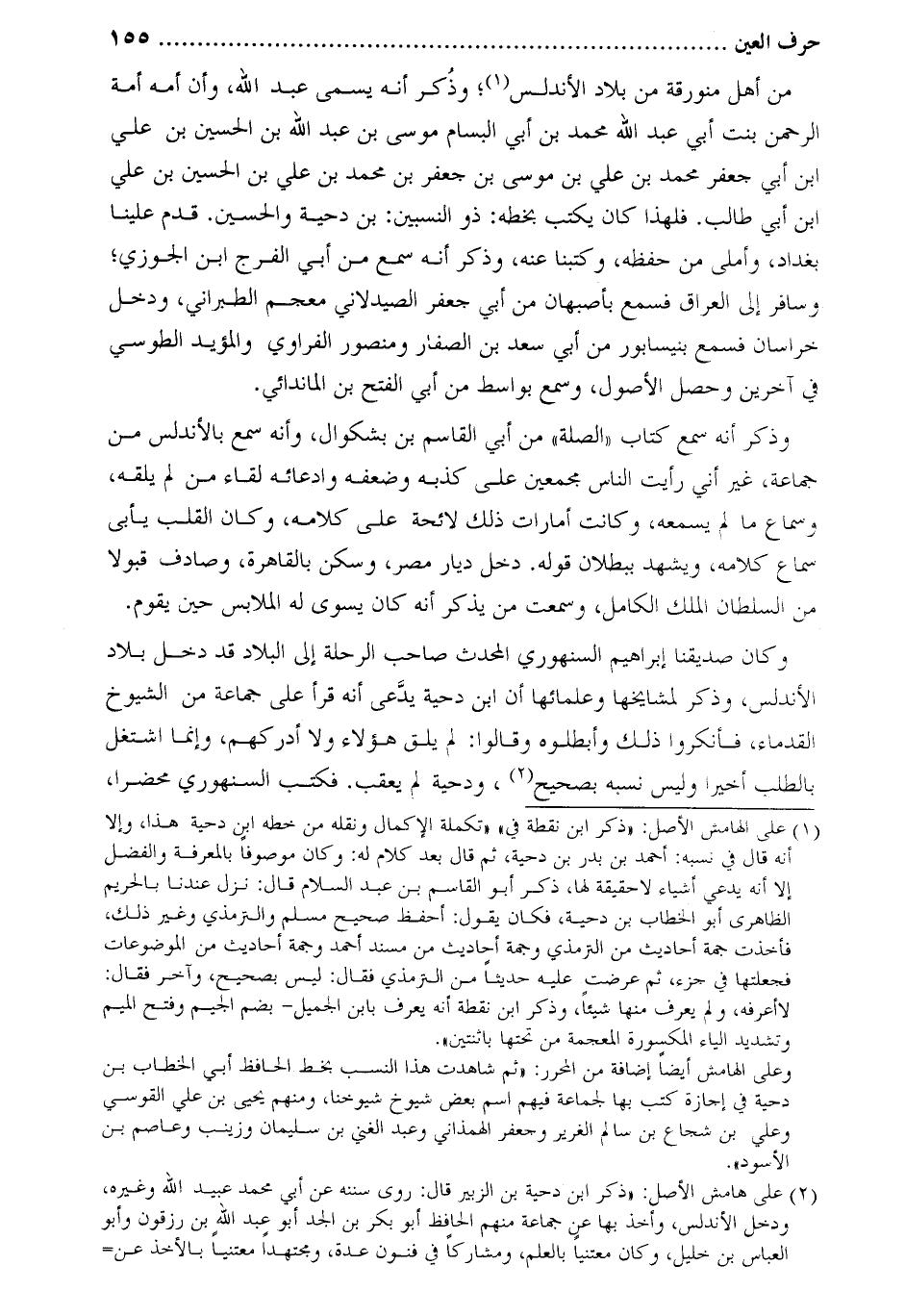 وكان صديقنا إبراهيم السنهوري المحدث صاحب الرحلة إلى البلاد قد دخل بلاد الأندلس، وذكر لمشايخها وعلمائها أن ابن دحية يدّعى أنه قرأ على جماعة من الشيوخ القدماء، فأنكروا ذلك وأبطلوه وقالوا: لم يلق هؤلاء ولا أدركهم، وإنما اشتغل بالطلب أخيرا وليس نسبه بصحيح [2] ، ودحية لم يعقب. فكتب السنهوري محضرا،