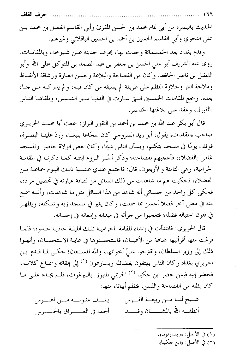 قال الحريري: فابتدأت في إنشاء المقامة الحرامية تلك الليلة حاذيا حذوه؛ فلما فرغت منها أقرأنيها جماعة من الأعيان، فاستحسنوها في غاية الاستحسان، وأنهوا ذلك إلى وزير السلطان، واقترحوا عليّ أخواتها، والله المستعان؛ حكى لما قدم ابن الحريري بغداد وكان الناس يهتفون بفضائله ويسارعون [1] إلى إلقائه وسماع كلامه، فحضر إليه فيمن حضر ابن حكينا [2] الحريمي المنبوز بالبرغوث، فلم يجده على ما كان يظنه من الفصاحة واللسن، فنظم أبياتا، منها: