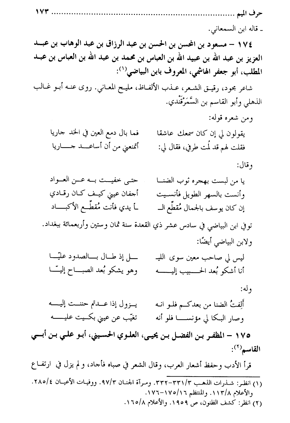 174- مسعود بن المحسن بن الحسن بن عبد الرزاق بن عبد الوهاب بْن عَبْد العزيز بْن عَبْد اللَّه بْن عُبَيْد اللَّه بْن الْعَبَّاس بْن مُحَمَّد بْن عبد الله بن العباس بن عبد المطلب، أبو جعفر الهاشمي، المعروف بابن البياضي [1] :