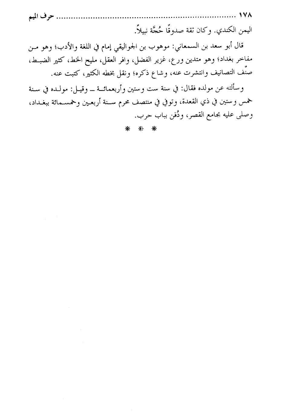 قال أبو سعد بن السمعاني: موهوب بن الجواليقي إمام في اللغة والأدب؛ وهو من مفاخر بغداد؛ وهو متدين ورع، غزير الفضل، وافر العقل، مليح الخط، كثير الضبط، صنّف التصانيف وانتشرت عنه، وشاع ذكره؛ ونقل بخطه الكثير، كتبت عنه.