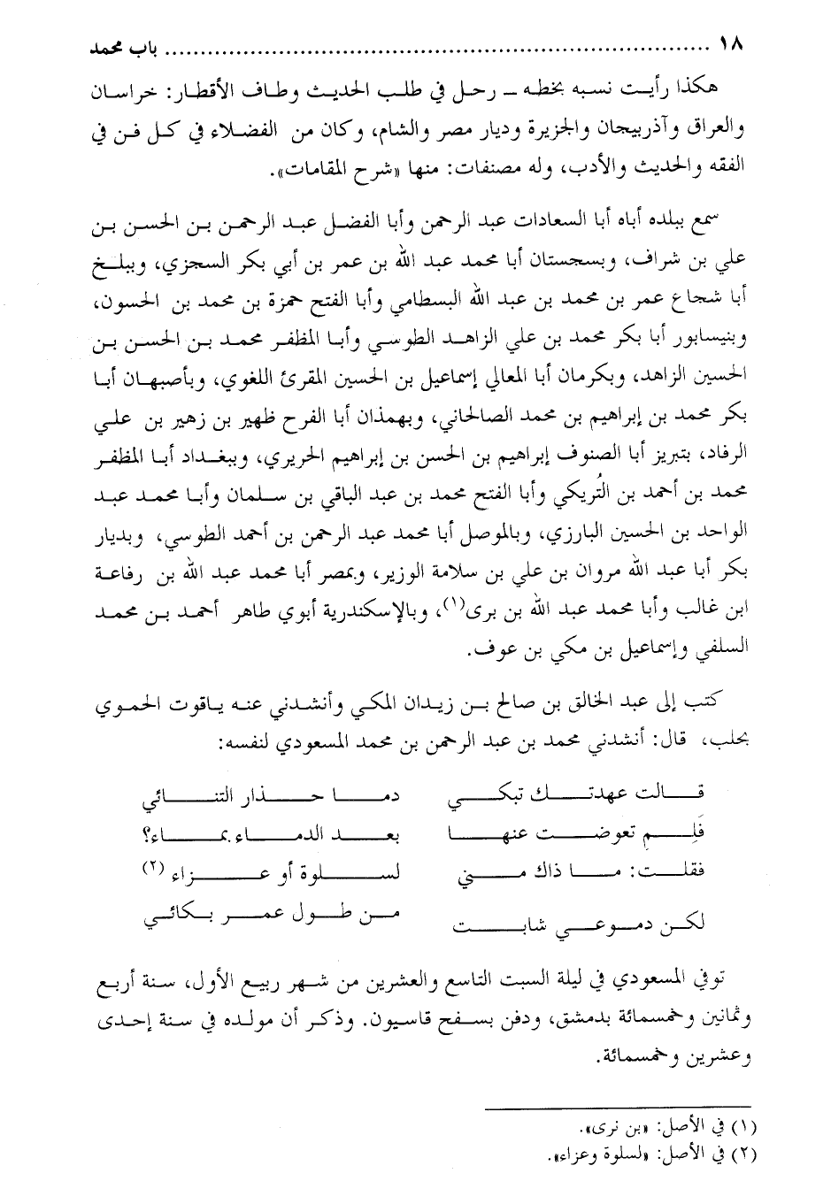 كتب إلى عبد الخالق بن صالح بن زيدان المكي وأنشدني عنه ياقوت الحموي بحلب، قال: أنشدني محمد بن عبد الرحمن بن محمد المسعودي لنفسه: