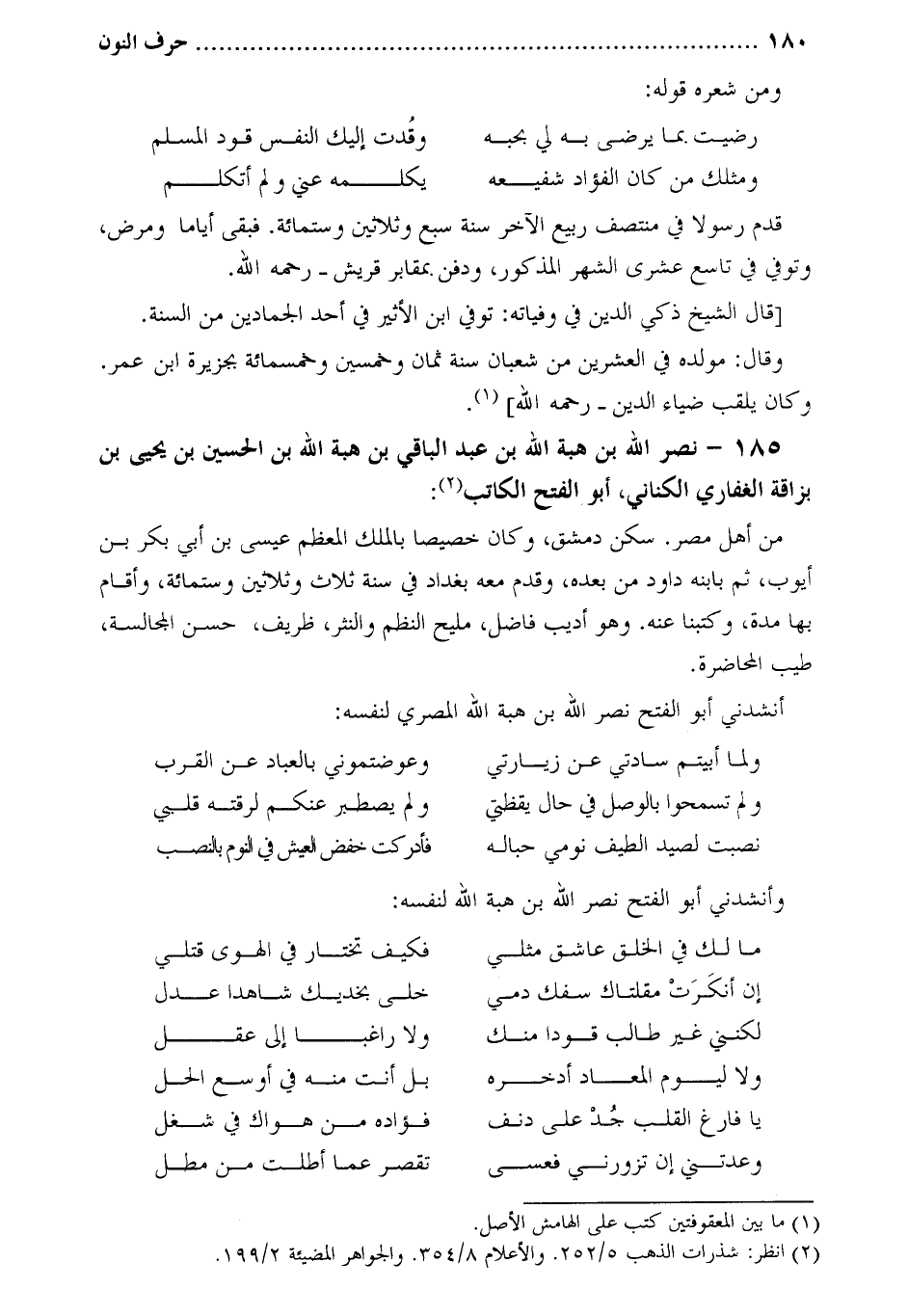 185- نصر الله بن هبة الله بن عبد الباقي بن هبة الله بن الحسين بن يحيى بن بزاقة الغفاري الكناني، أبو الفتح الكاتب [2] :