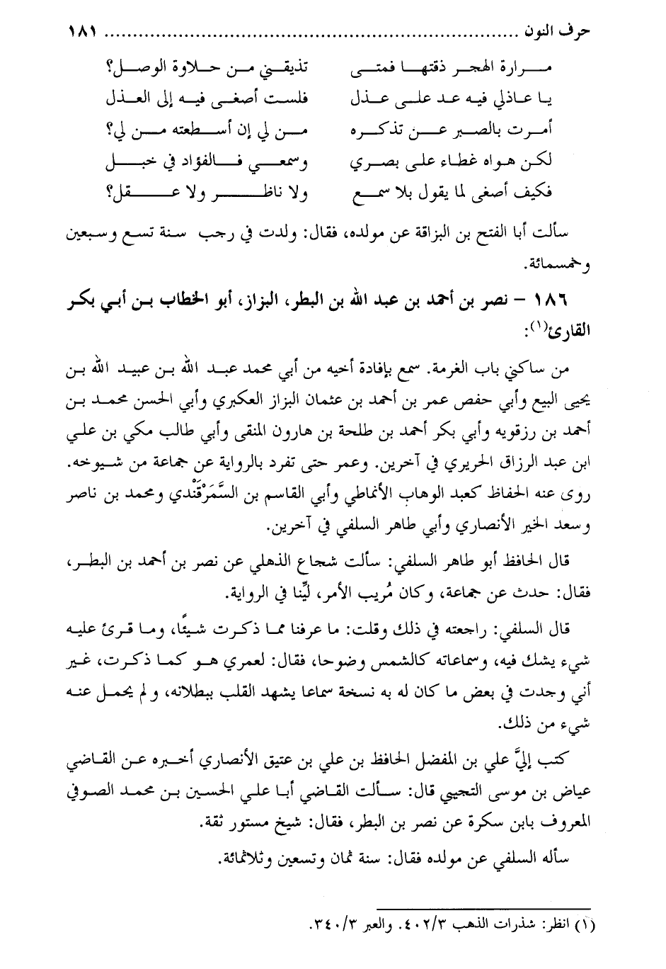 قال الحافظ أبو طاهر السلفي: سألت شجاع الذهلي عن نصر بن أحمد بن البطر، فقال: حدث عن جماعة، وكان مريب الأمر، ليّنا في الرواية.