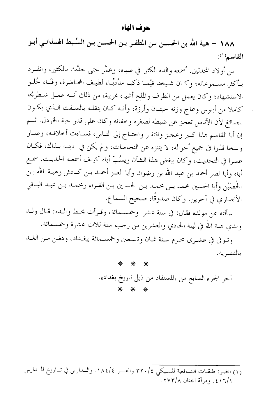 آخر الجزء السابع من «المستفاد من ذيل تاريخ بغداد» .